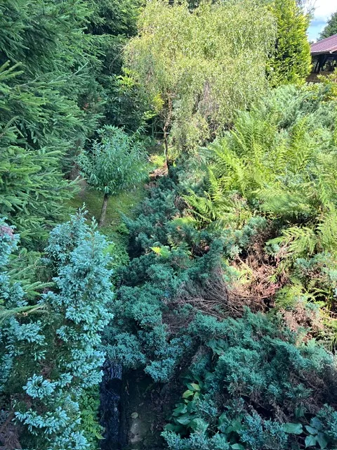 Pozemek 1 534 m² plný vzrostlé zeleně, rozdělený na relaxační zónu a pěstitelskou část.