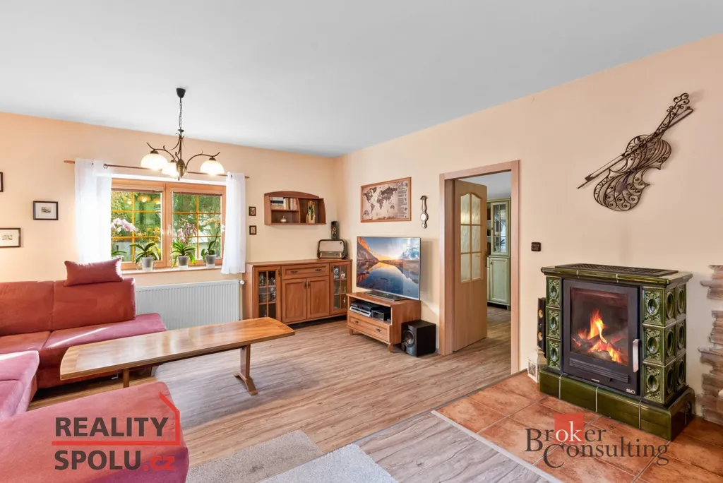 Vytápění je řešeno dvěma samostatnými topnými okruhy – tepelné čerpadlo IVT (vzduch–voda) a krb s teplovodním výměníkem. K dispozici je i fotovoltaická elektrárna z roku 2023 s bateriovým úložištěm, která výrazně snižuje provozní náklady.