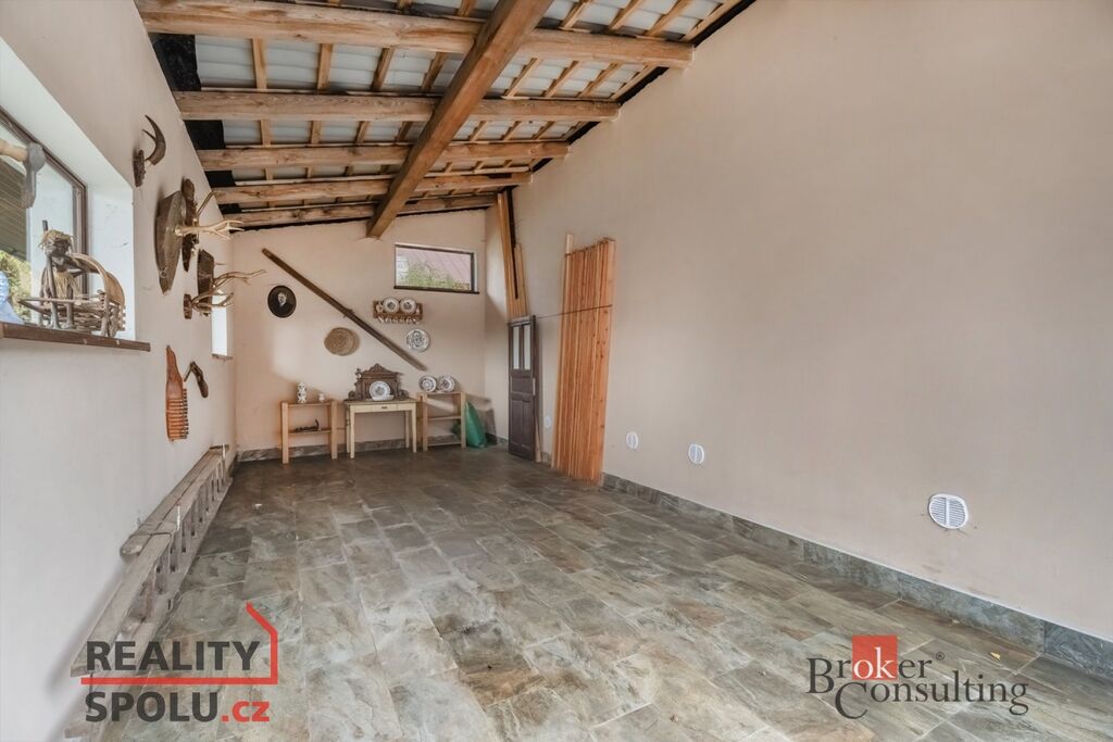 Součástí nabídky je rovněž samostatně stojící garáž se skladovým prostorem. Velkou výhodou je možnost využití horní terasy pro letní posezení s výhledem do přírody či spodní kamenné terasy s venkovním krbem, které je ideální pro setkání s přáteli při grilování.