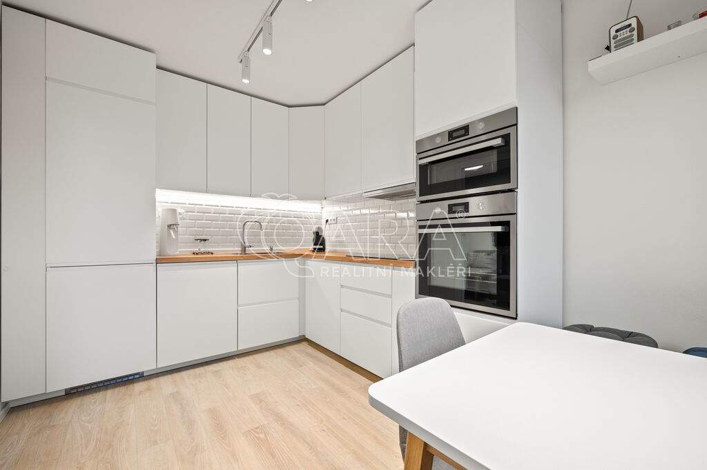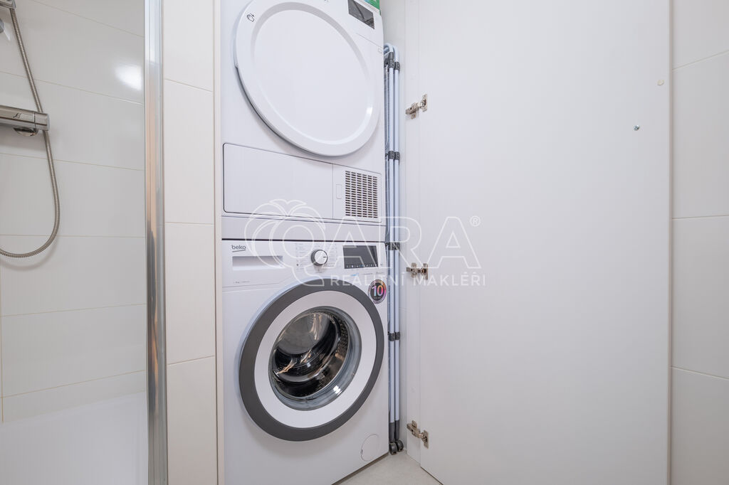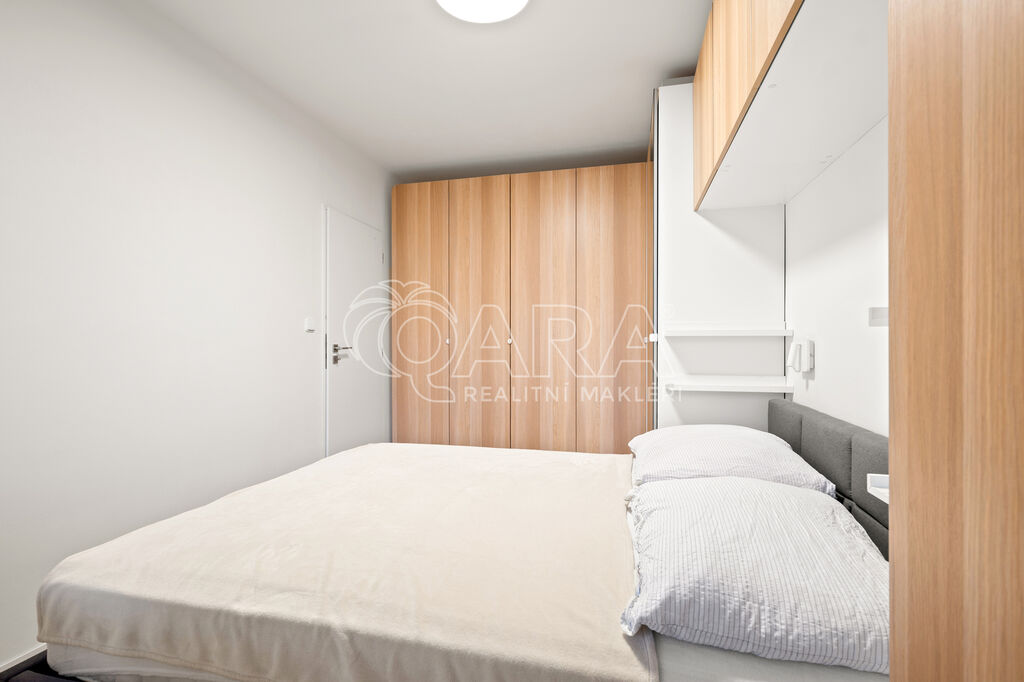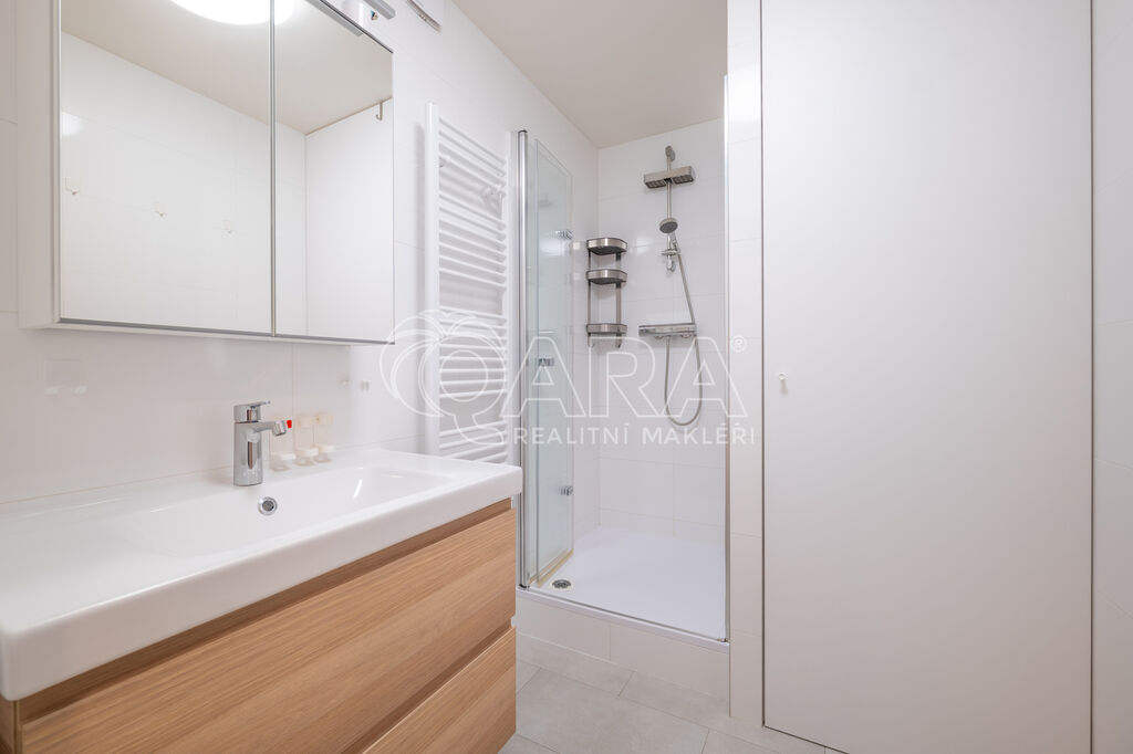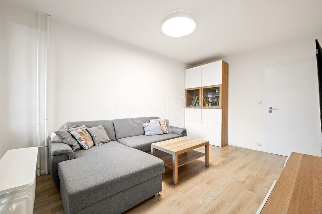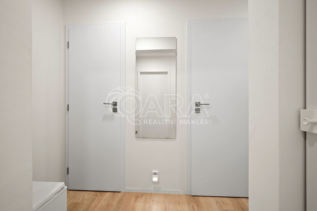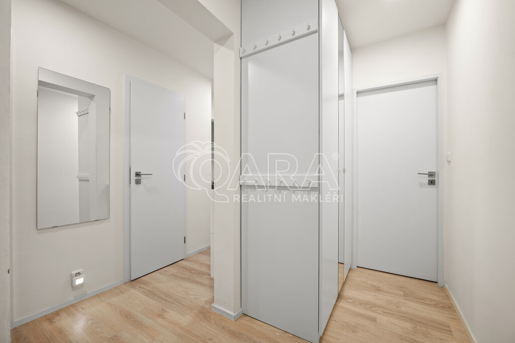 Byt se pronajímá kompletně vybavený, takže k nastěhování vám postačí pouze osobní věci. Součástí je kuchyňská linka s vestavěnými spotřebiči (indukční varná deska, digestoř, elektrická trouba, mikrovlnná trouba, lednice s mrazákem), dále jídelní stůl se židlemi, sedací souprava, TV stolek s televizí, postel, vestavěné skříně a botník. K dispozici je rovněž pračka a sušička. Nábytek je možné v případě zájmu i odstěhovat a byt pronajmout nevybavený.