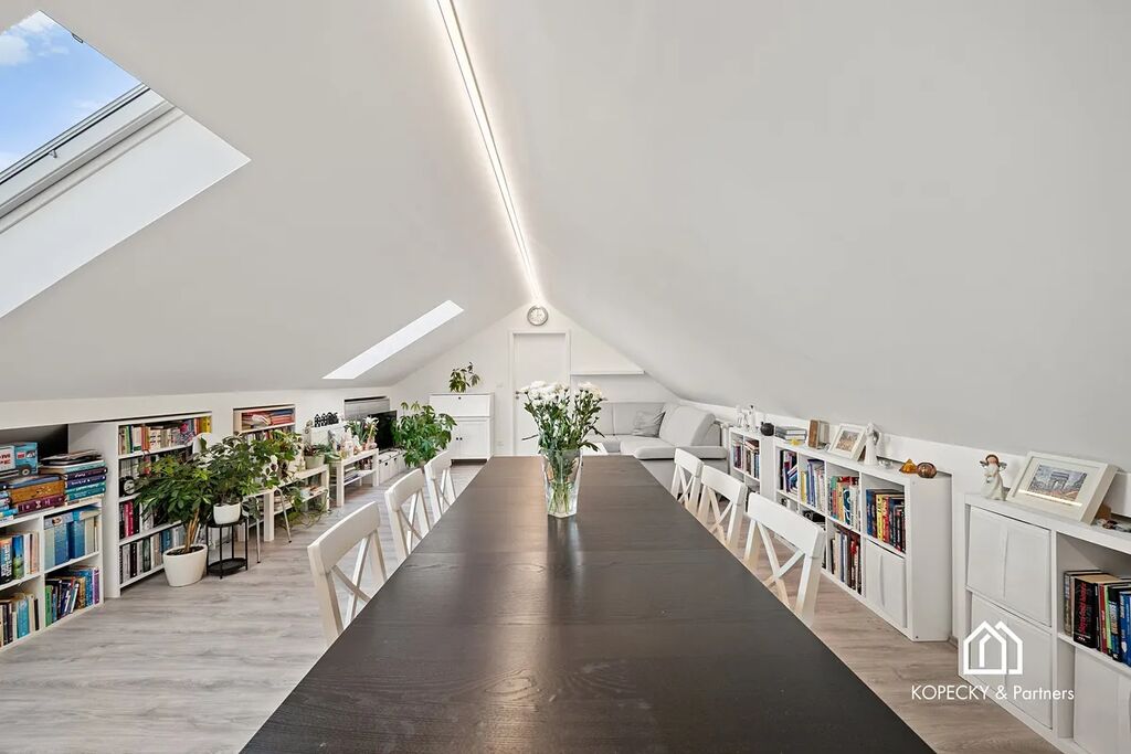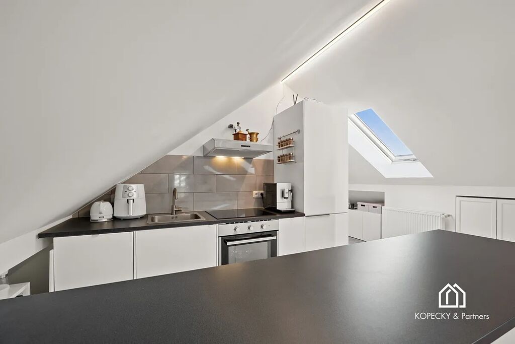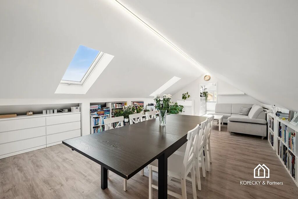 Hlavní obytný prostor působí světlým a příjemným dojmem, o což se starají nová střešní okna s trojskly, zajišťující kvalitní tepelnou i akustickou izolaci. Dispozice je řešena tak, aby nabídla dostatek komfortu i funkčnosti – od obývací části přes kuchyňskou zónu až po možnost vytvoření pracovního místa. Samostatná ložnice je situovaná tak, aby poskytovala soukromí a klid. Koupelna je moderní, čistá a prakticky řešená.