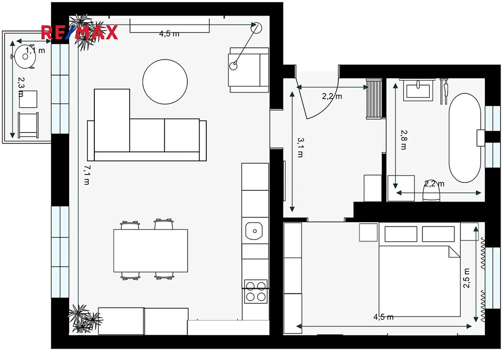 Byt se nachází ve 3. nadzemním podlaží a nabízí promyšlenou dispozici: předsíň s místem pro vestavné skříně, světlý obývací pokoj s kuchyňským koutem a vstupem na balkón, ložnici a koupelnu s toaletou. Balkón je orientován na jihovýchod s výhledem do zeleně se vzrostlými stromy – ideální místo pro klidné posezení u ranní kávy nebo večerní sklenky vína. Ložnice a koupelna směřují na severozápad, což zajišťuje příjemné klima i v letních měsících.