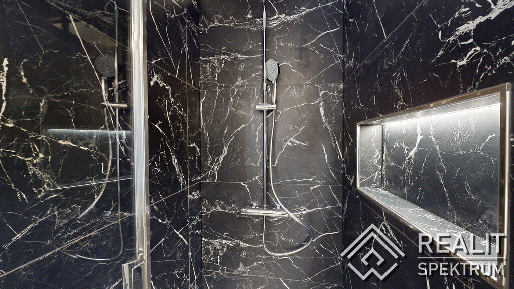 • Koupelna: Luxusně zpracovaná s elegantním sprchovým koutem, který je vybaven osvětlenou nikou. Nechybí ani otopný elektrický žebřík.