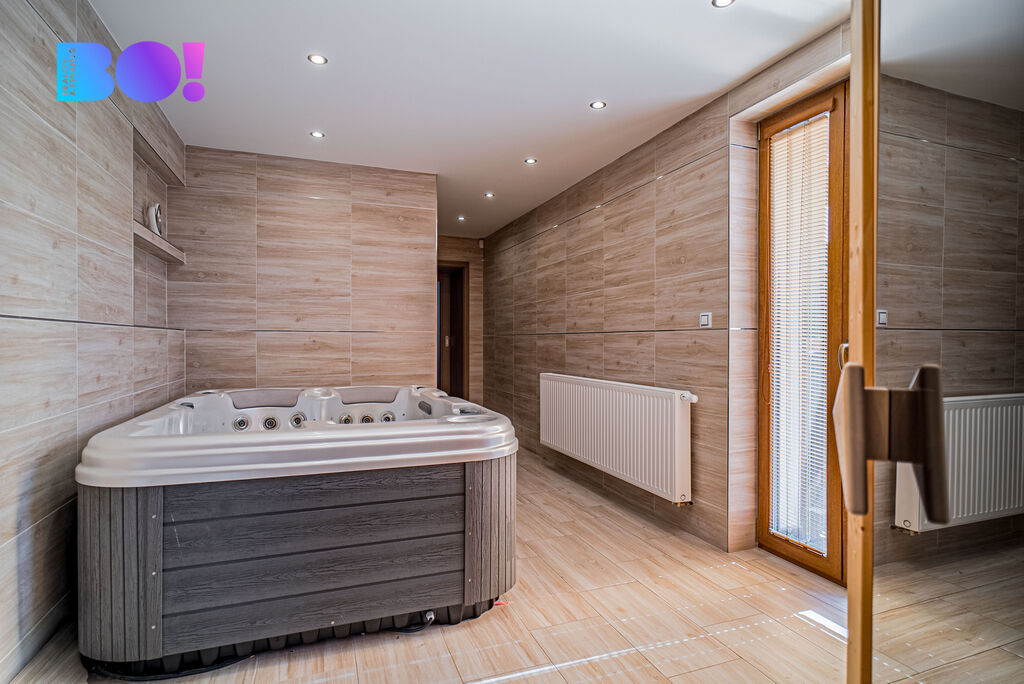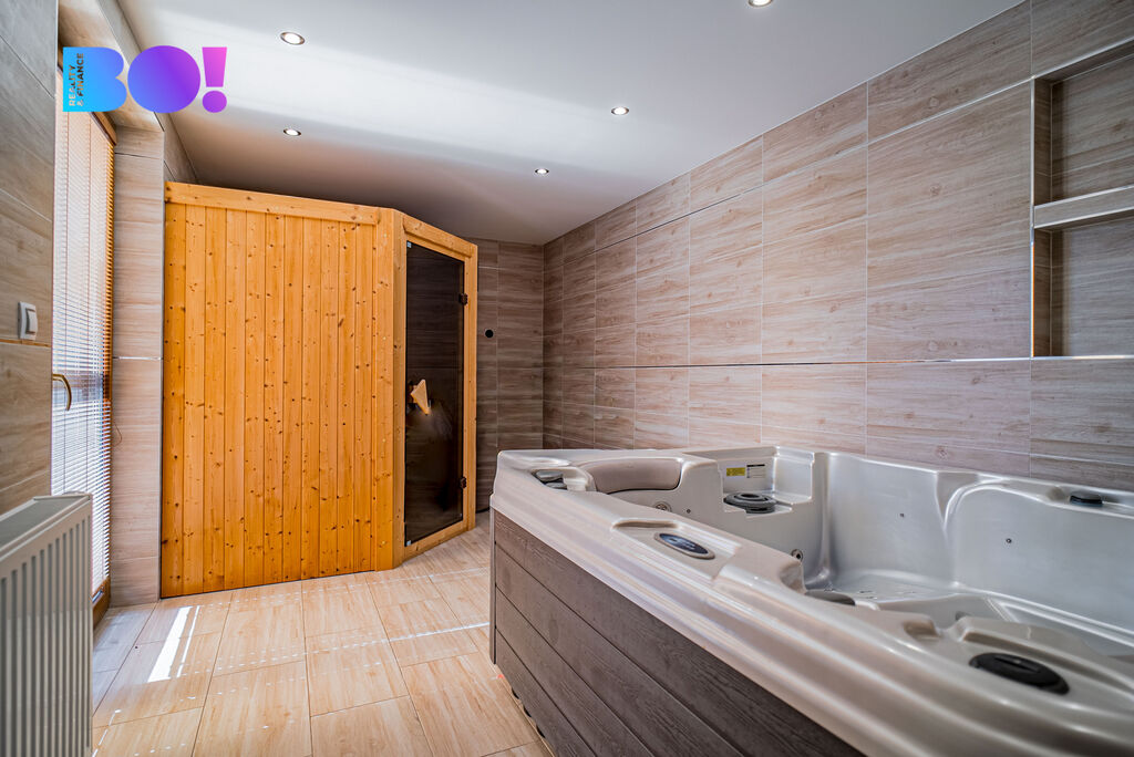 Velká wellness zóna – finská sauna, vířivka, sprcha a WC pro relaxaci.