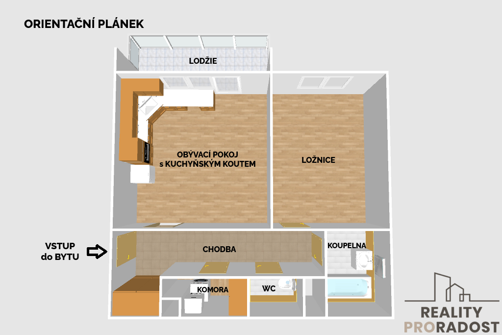 Dispozice bytu je prakticky řešena a nabízí dostatek místa pro jednotlivce (studenty), pár či menší rodinu .Všechny místnosti jsou neprůchozí, přístupné z chodby – viz orientační plánek.