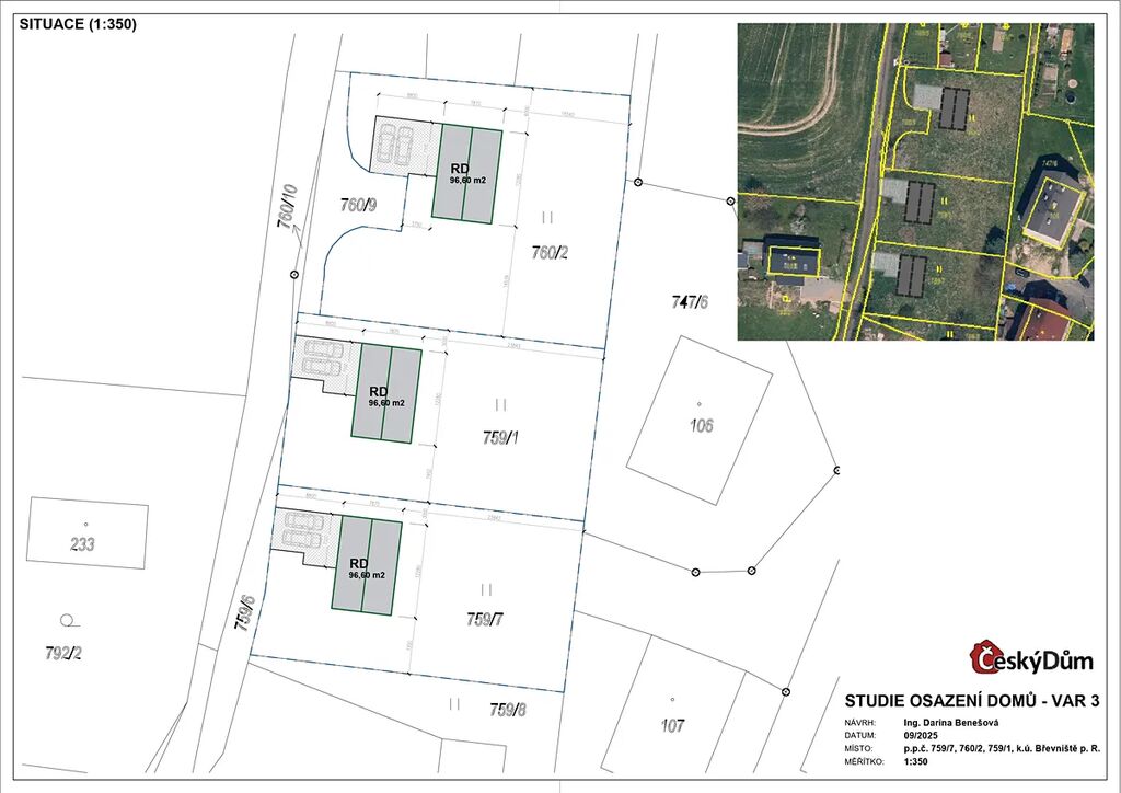 Celková plocha pozemků činí 3156 m2 a jsou rozděleny na tři samostatné stavební parcely. Od stavebního úřadu již máme předběžné informace o zastavitelnosti ke každému pozemku zvlášť, včetně požadavků na vzhled budoucích nemovitostí. Veškerou dokumentaci vám samozřejmě na vyžádání zašleme.