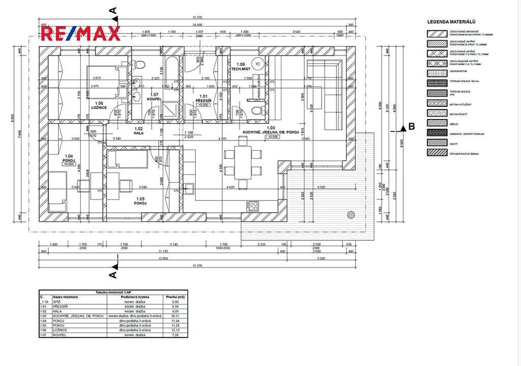 Prostorný obývací pokoj s jídelnou a kuchyní (38,51 m²) – s přímým vstupem na terasu a možností napojení na venkovní kryté posezení.