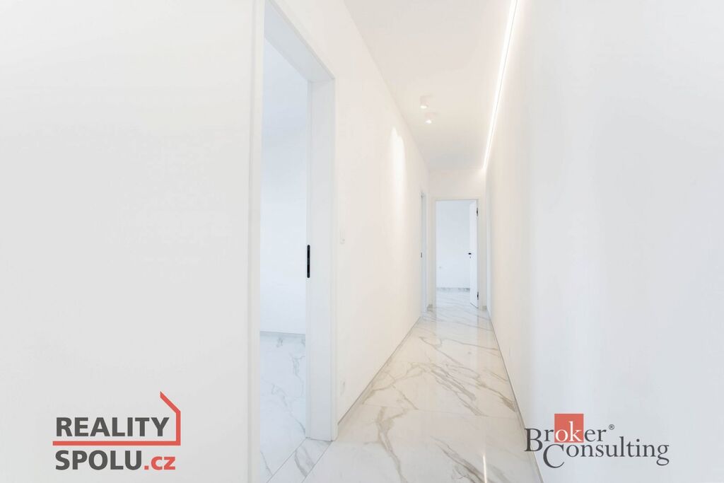 V bytě se nacházejí dvě designové koupelny – jedna vybavená prostornou vanou a toaletou a druhá se sprchovým koutem a taktéž s toaletou. Elegantní chodba s efektním kulatým zrcadlem dotváří luxusní atmosféru celého interiéru a poskytuje dostatek prostoru a úložných možností.