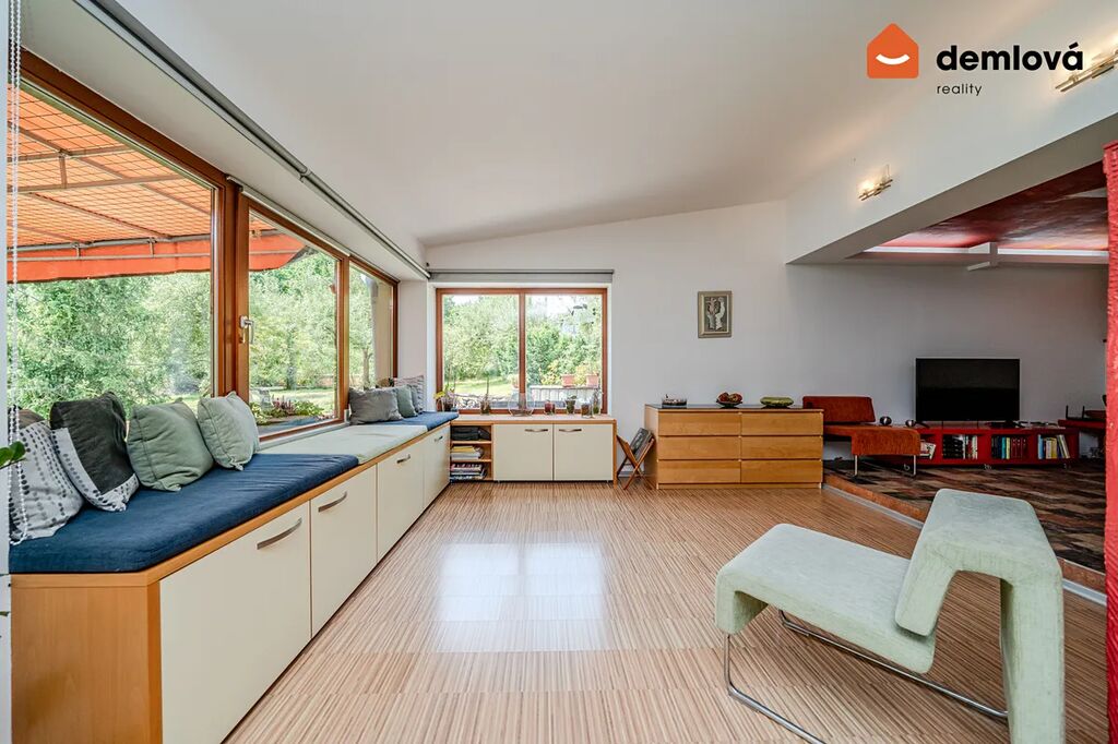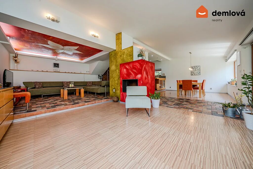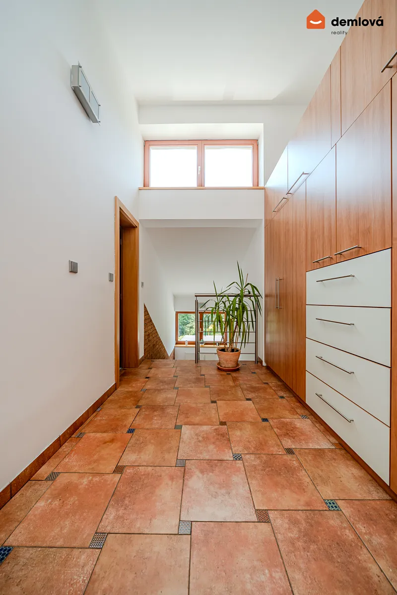 Dům zaujme netradičním kaskádovým řešením interiéru a promyšlenou dispozicí. K dispozici jsou tři koupelny, tři toalety (z toho jedna samostatná) a garáž pro dvě auta o výměře 38 m². Před domem je navíc dostatek místa pro parkování dalších dvou vozidel.