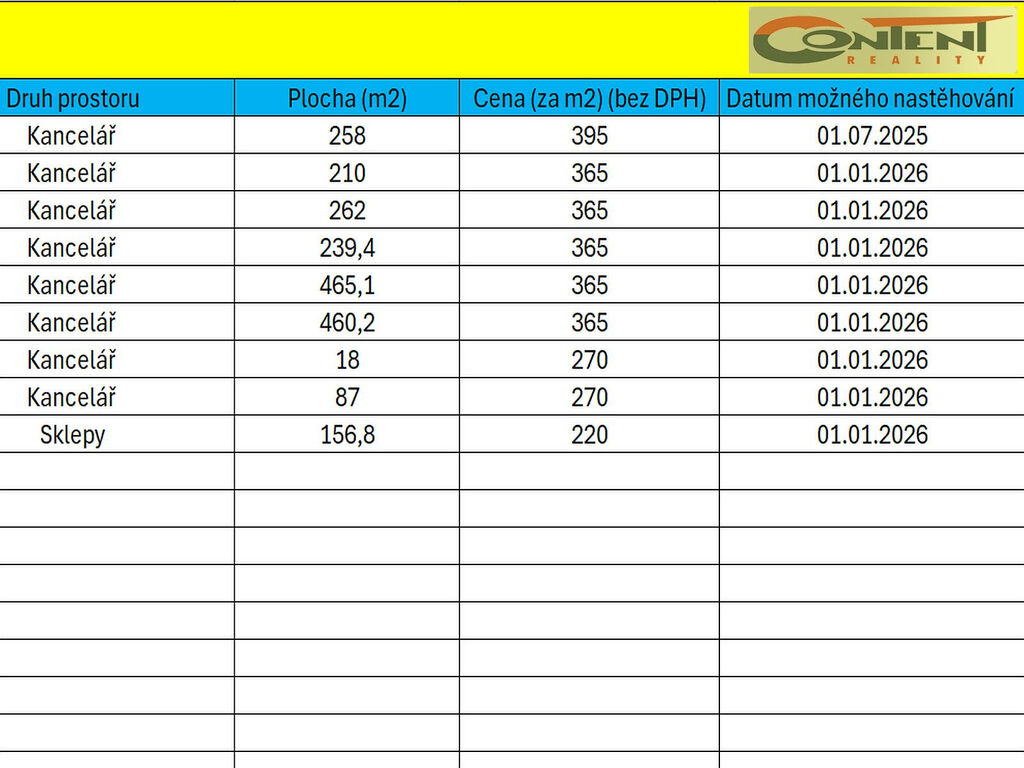 Cena nájmu je 365,-Kč/m²/měsíc + služby 15 Kč/m²/měsíc.