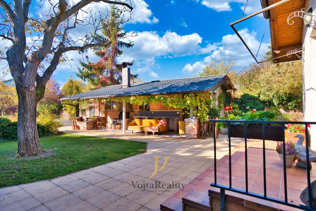 Originálním bonusem je dům pro hosty, či ateliér na zahradě s vlastím hygienickým zázemím a zastřešeným posezením do vnitrobloku.