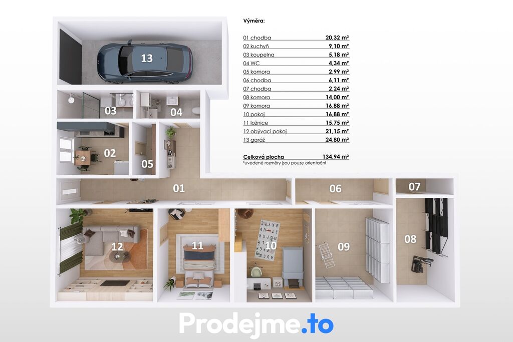 Dům má dispozici 4+1 s celkovou užitnou plochou 135 m2, doplněnou o další prostory. Obytnou část tvoří kuchyně, obývací pokoj, ložnice a dva pokoje. Koupelna je vybavená zděným sprchovým koutem, umyvadlem a má i místo pro pračku. Toaleta je samostatná. Praktickým doplňkem je také komora a veranda.