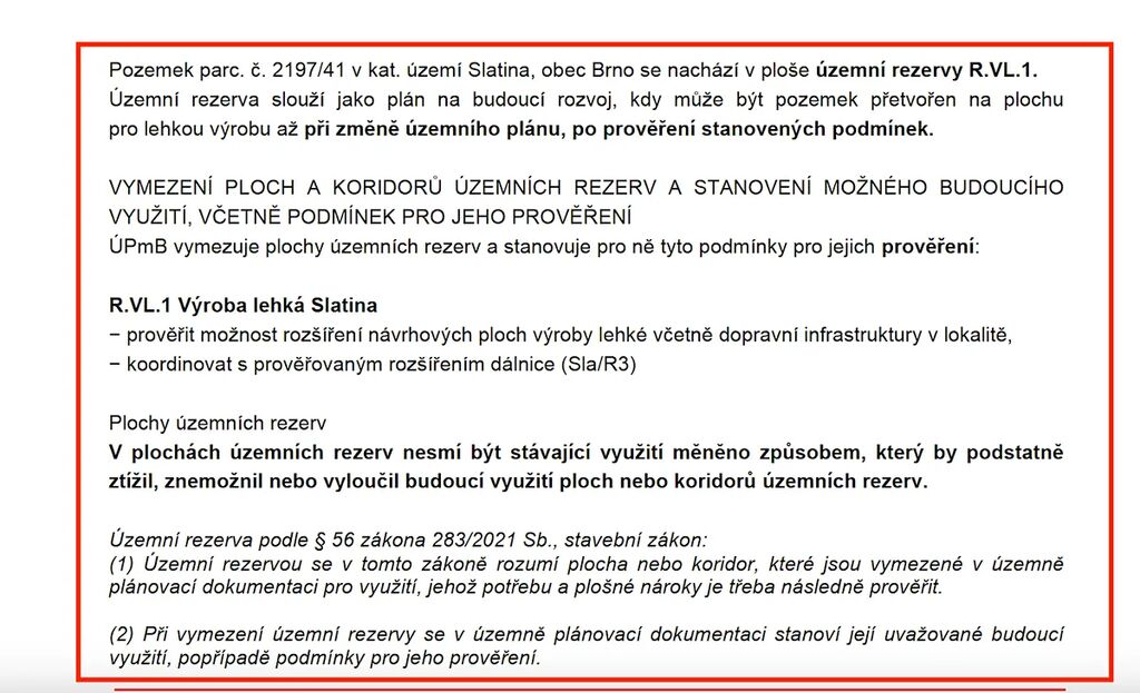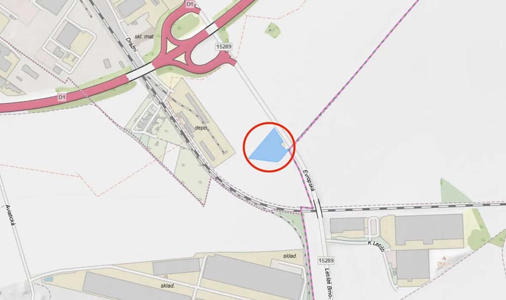 Prodej pozemku ul. Evropská, Slatina, Brno- město, určeného k budoucí komerční zástavbě - pozemek veden dle. nového územního plánu jako územní rezerva ke komerční výstavbě označené jako R.VL.1 - výroba lehká Slatina - výška zástavby 3 - 7 m, celková výměra pozemku 10.646 m2, lichoběžníkový tvar pozemku - rozměry pozemku šířka 105m, délka 100m, velmi dobrá lokalita přímo příjezdové komunikace na letiště Brno Tuřany vzdáleného od letiště 1,5 km a pozemek je situovaný přímo u sjezdu z dálnice D1 vzdálenost ke sjezdu 550 m.