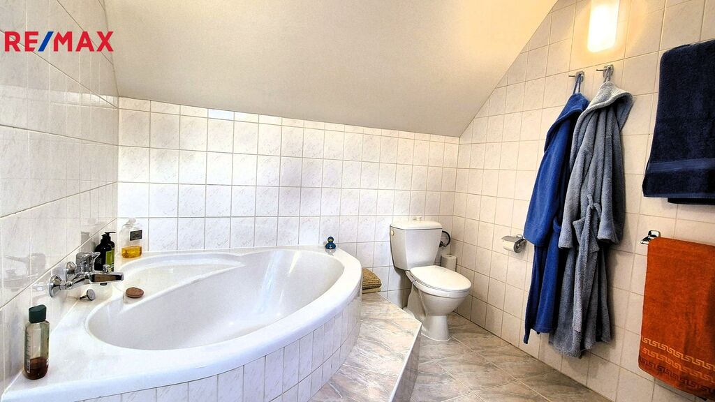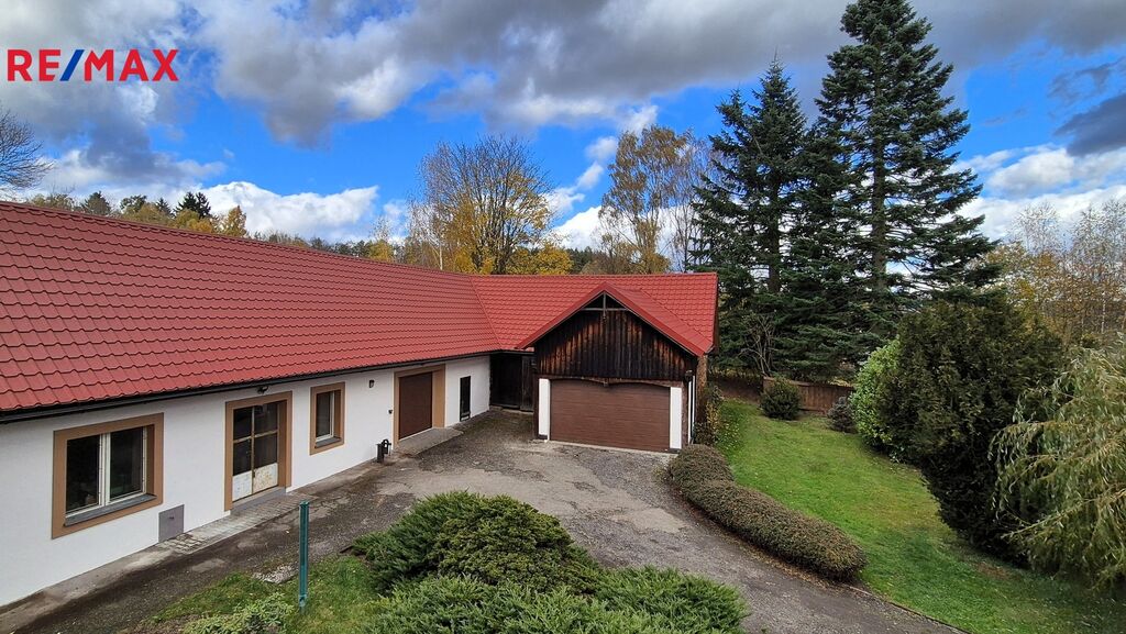 Dům je ve velmi dobrém stavu (po nedávné rekonstrukci střechy, obytného podkroví, části obytného přízemí a garáží) a zahrnuje jak prostorné obytné místnosti, tak i výborné zázemí pro možné podnikatelské aktivity. V přízemí vlevo se nachází hlavní obytná část s velkým obývacím pokojem vybaveným krbem, který navozuje příjemnou atmosféru. Z obývacího pokoje je jednak přístup do upravené oplocené zahrady a po schodišti do podkroví, kde jsou k dispozici 4 ložnice a kuchyň s jídelním koutem, ideální pro rodinné večeře. V přízemí vpravo je další obytná jednotka s možností vybudování samostatného bytu, což je výhodné pro vícegenerační bydlení. Další možností je využití těchto prostor pro podnikání, např. jako kanceláře.