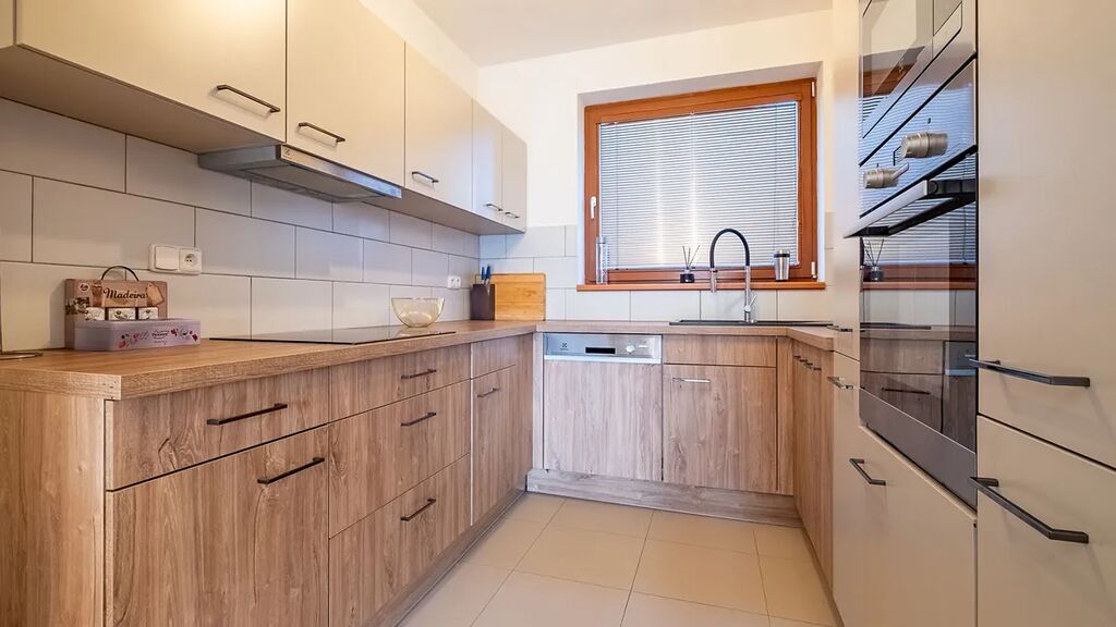 Interiér domu odráží moderní standardy a je plně vybavený, včetně kuchyňských spotřebičů jako je vestavěná lednice, mrazák, varná deska, trouba, a myčka. Z nábytku je dům vybaven postelemi, vestavěnými skříněmi, pohovkou, obývací stěnou a stolem s židlemi. Vytápění a teplou vodu zajišťuje kondenzační plynový kotel. V přízemí je podlahové topení a v patře radiátory. Dům je připojen k veřejné síti, voda, kanalizace, elektřina a plyn.