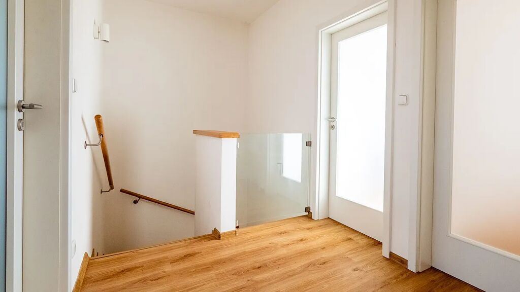 Přízemí tvoří vstupní chodba, moderní kuchyň, obývací pokoj se vstupem na terasu, samostatné WC, skladová místnost pod schody.