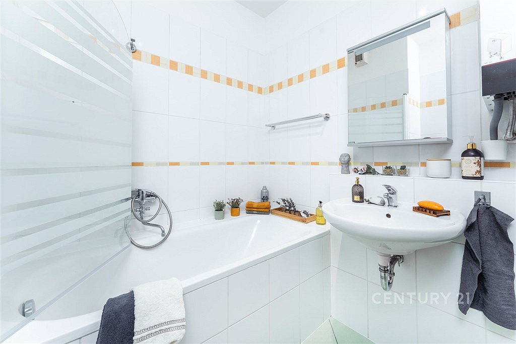 Vytápění a ohřev vody je řešen nedávno nově pořízeným plynovým kotlem Viessmann, umístěným v koupelně s vanou, kde se nachází i toaleta, přípojka na pračku a místo na úložné prostory.