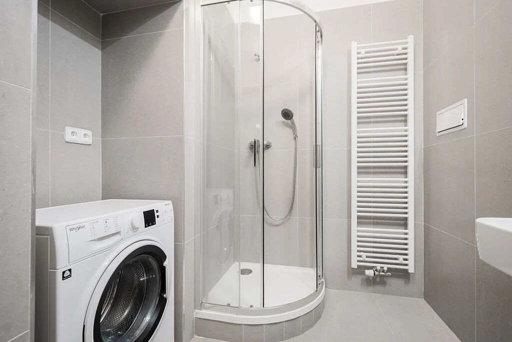 Interiér bytu je nezařízený a dispozičně nabízí vstupní chodbu (10,23m2), obývací pokoj (18,81m2) propojený s kuchyní, s mezi vstupním prostorem k užívání jako šatna ( 3,42m2) navazujícím na vstup do ložnice (19,16m2). Kuchyň je vybavená kuchyňskou linkou včetně spotřebičů: lednice s mrazákem, varná deska a elektrická trouba. Moderní koupelna má vstup z chodby a disponuje sprchovým koutem a prostorem pro pračku (pračka je součástí vybavení bytu). Dále se v bytě samostatná toaleta (1,85m2) a komora (1,30m2) se vstupem z předsíně.