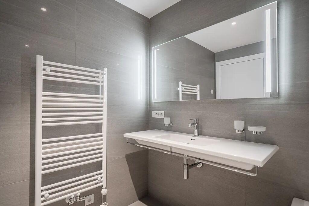 Pozn: Fotky jsou z jiného bytu v budově ve stejném standardu. Plán odpovídá bytu.