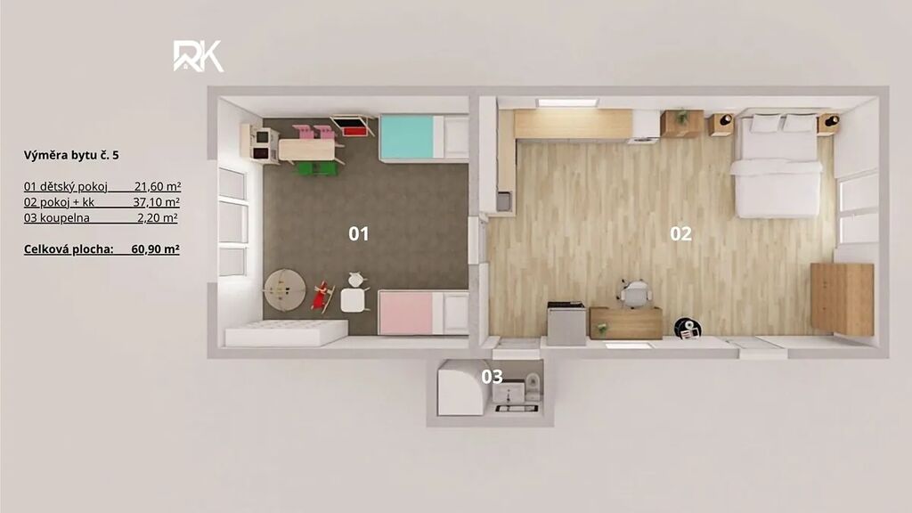 Dispozice je nyní řešena jako 3+kk, rozdělené na dva samostatné byty s vlastními vchody – byt 2+kk a garsoniéru. Každý má svou koupelnu, toaletu i kuchyňský kout. Tato varianta nabízí skvělou možnost – v jednom bytě můžete pohodlně bydlet a druhý pronajímat.