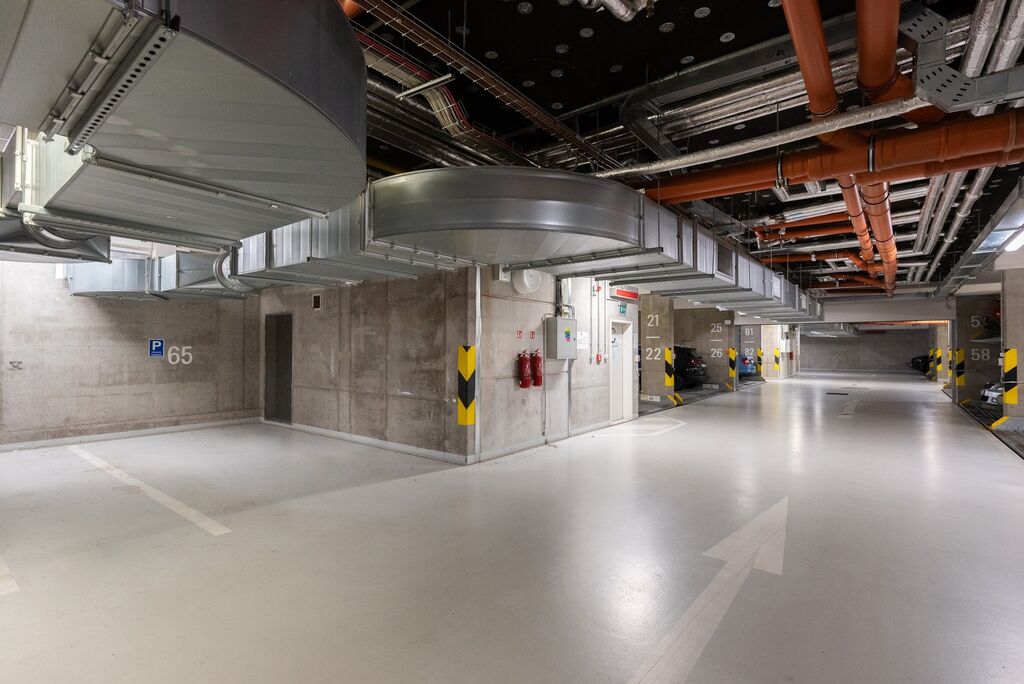 K bytu patří sklepní kóje o velikosti 2m2 a 1 parkovací stání v podzemních garážích.