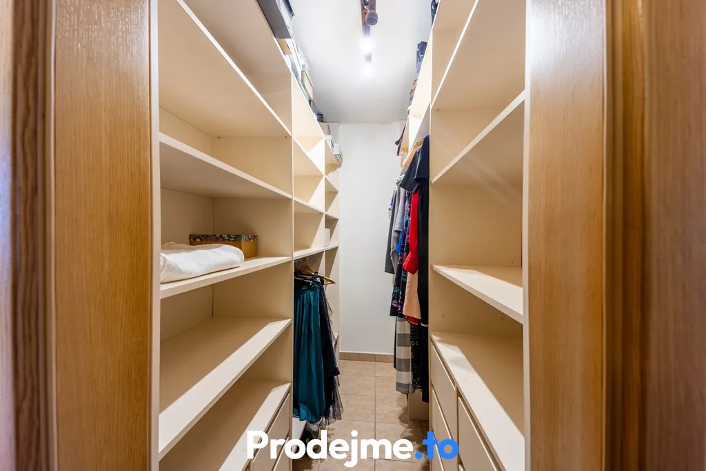 Tři samostatné pokoje poskytují dostatek soukromí rodičům i dětem. Koupelna s rohovou vanou a toaletou je doplněna druhou samostatnou toaletou. Prostorná šatna s vybavením po obou stranách a samostatná komora přinášejí nadstandardní úložné možnosti.