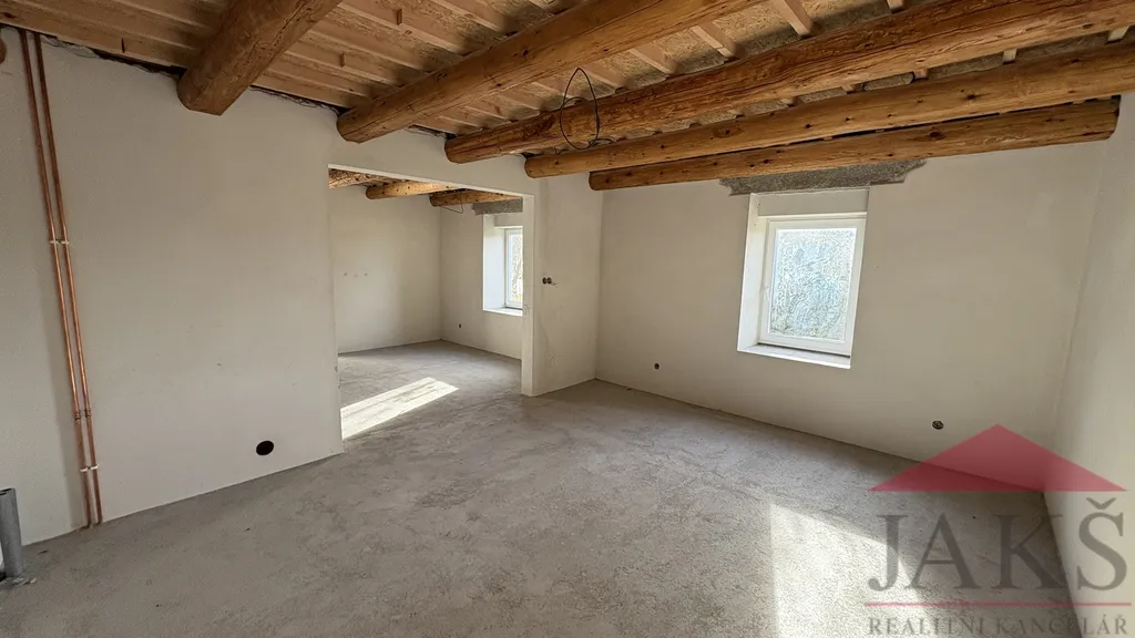 Započatá zevrubná rekonstrukce, přičemž je dokončený „obal“ a „střeva“ domu, jmenovitě: nová moderní dispozice 5+kk, střecha vč. klempířských prvků a částečně výměna krovů, vyvložkovaný nový komín, plastová okna 3-skla, strop vč. přiznaných pohledových trámů, podlahové topení v 1.NP a radiátory v podkroví vč. rozvodů v mědi, elektroinstalace vč. jističů, rozvody vody a odpadu v plastu, srovnané stěny vč. omítek, štuku a bílé výmalby, francouzské okno na budoucí terasu, srovnaná fasáda; k dokončení jsou pohledové prvky (podlahové krytiny; podhledy vč. izolace, která je v domě; příčky v podkroví, vnitřní dveře, sanita v koupelnách, osvětlení, kuch. linka...), schodiště, zdroj topení, jímka a terénní úpravy.