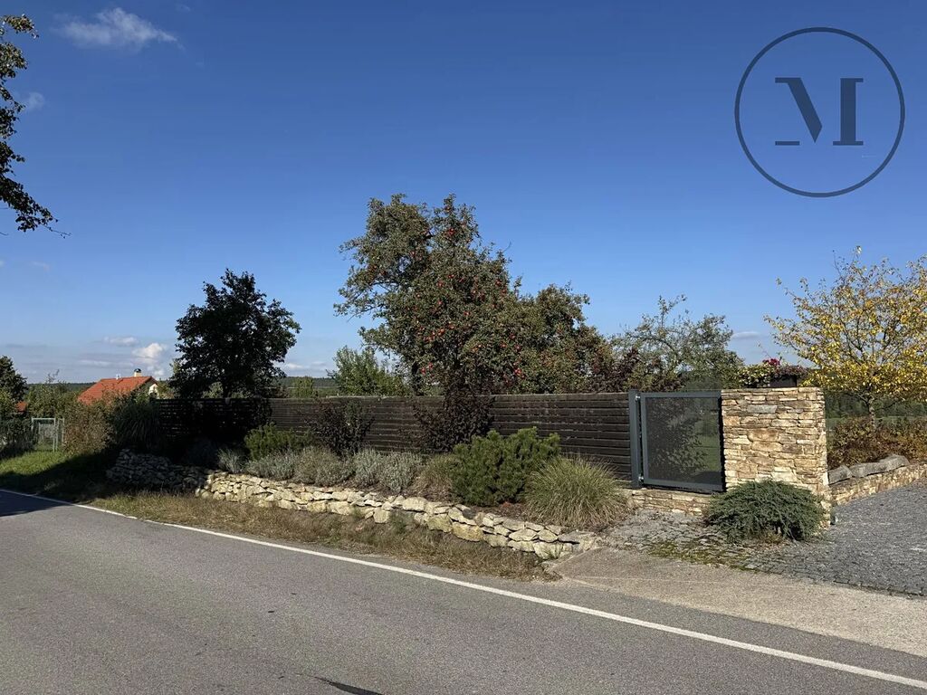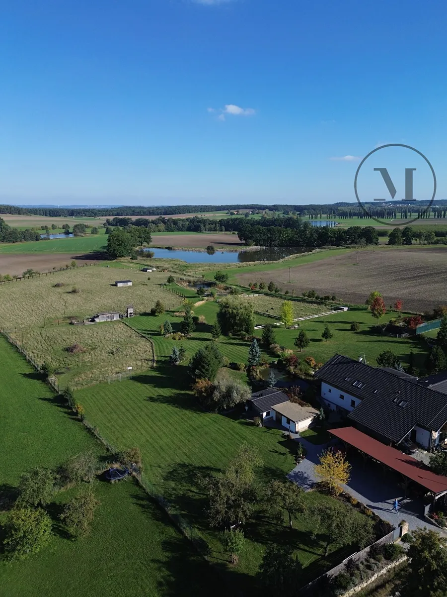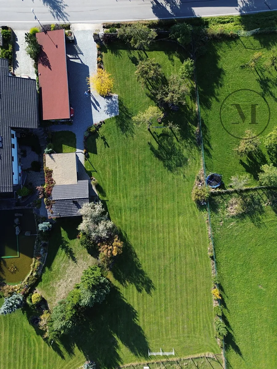 Pozemek je travnatý, rovinatý, doplněný o vzrostlé stromy, keře a krásnou zeleň, které vytvářejí příjemnou atmosféru soukromí. Z parcely je úchvatný výhled do krajiny – vidíte rybník a oboru s daňky, a jen pár kroků od hranice pozemku začíná les.