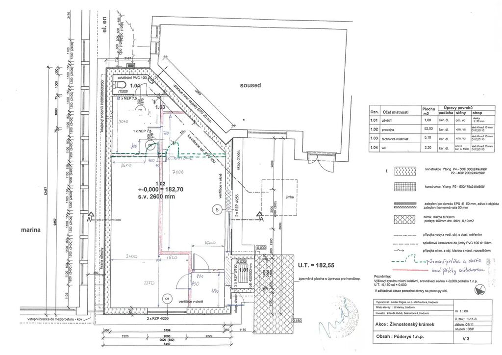 Dispozice: zádveří 1,8 m2, prodejní plocha 52 m2 (rozdělena sádrokartonovou příčkou na 2 prostory) technická místnost (kuchyňka se skladem) 5,1 m2, WC s umyvadlem 2,2 m2.