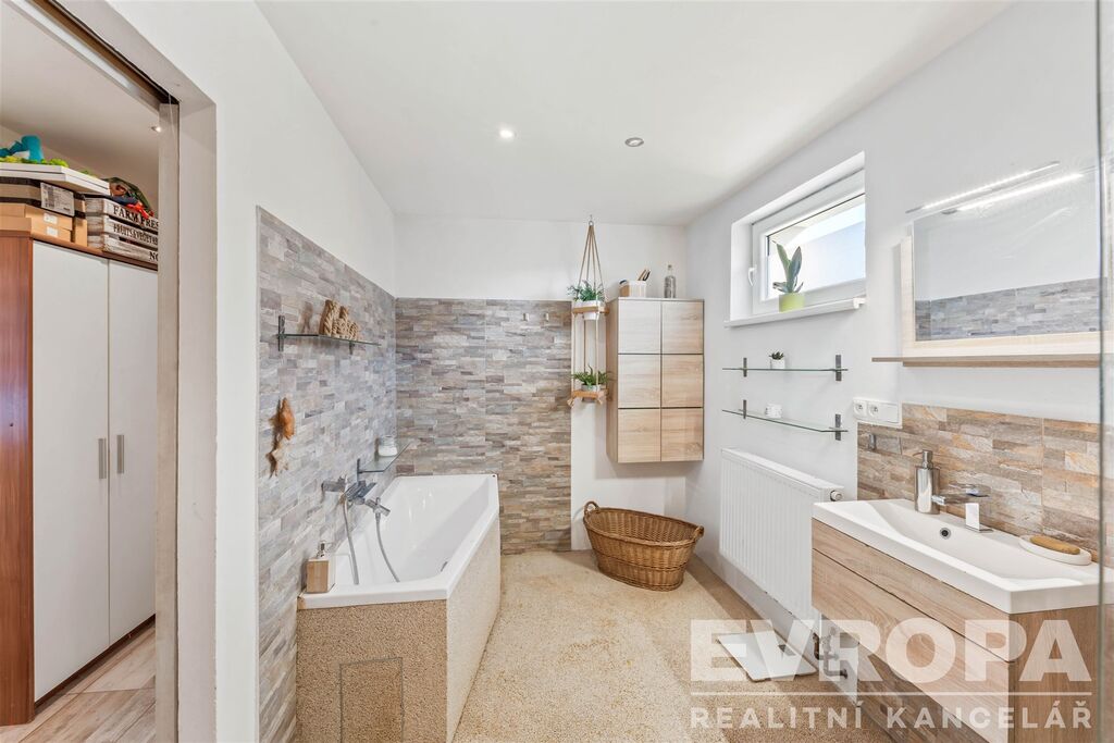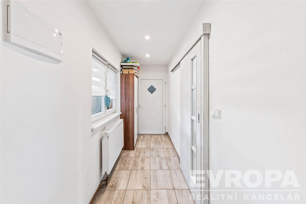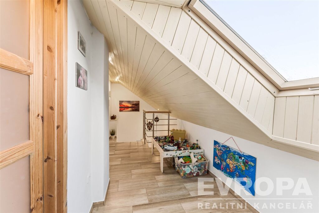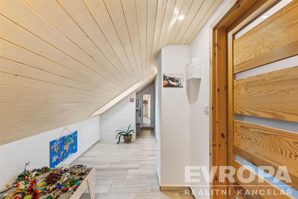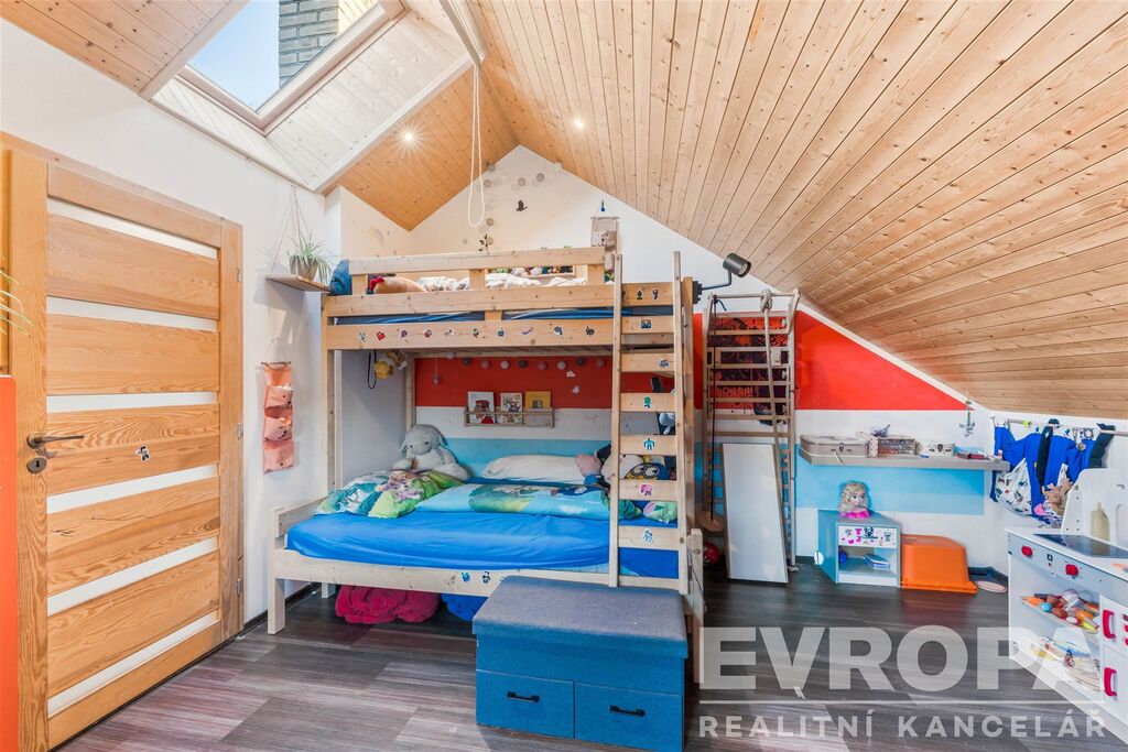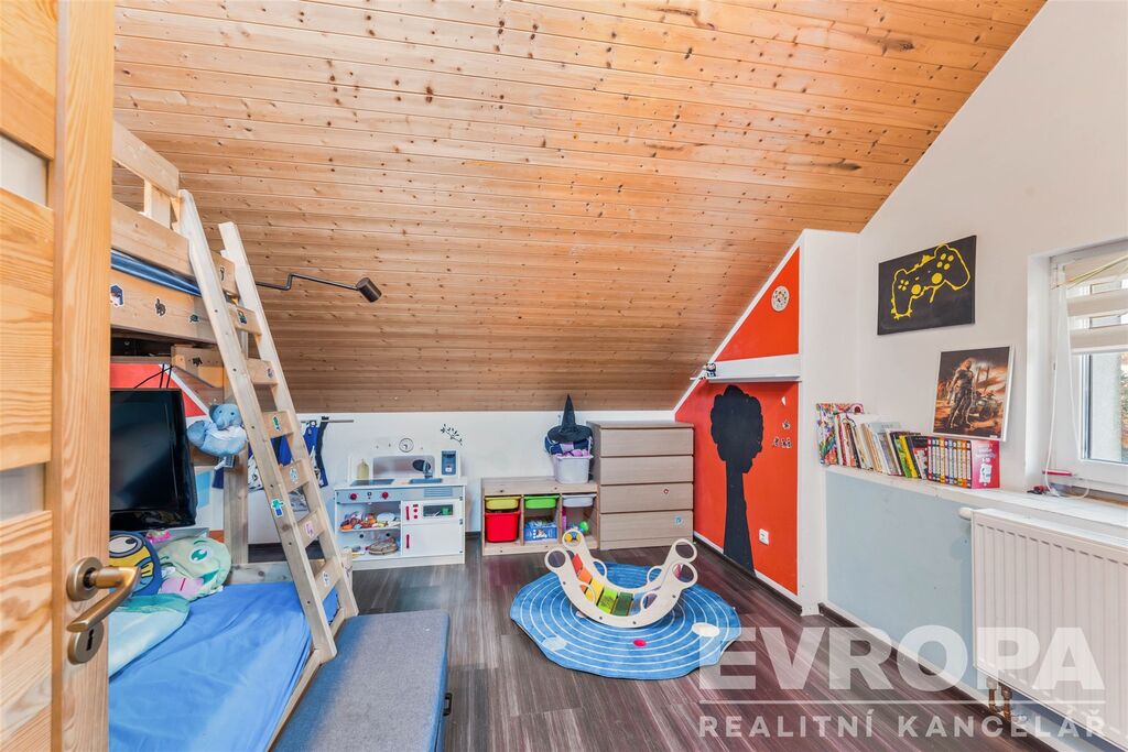 V patře jsou dva pokoje, ložnice (16,17 m2) a dětský pokoj (17 m2) a chodba (13,14 m2) a malá šatnička.