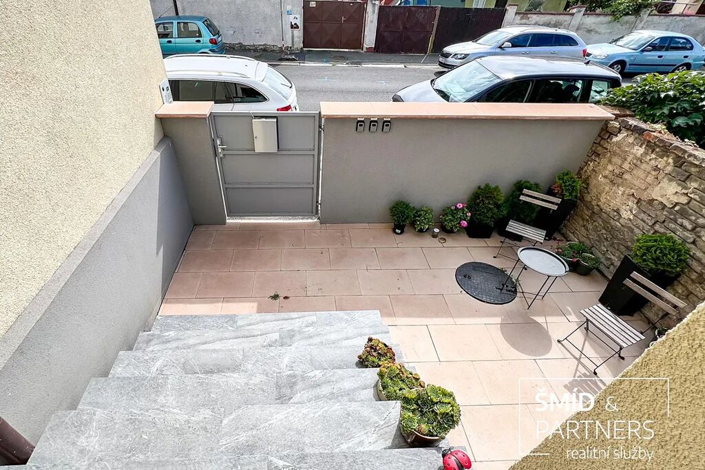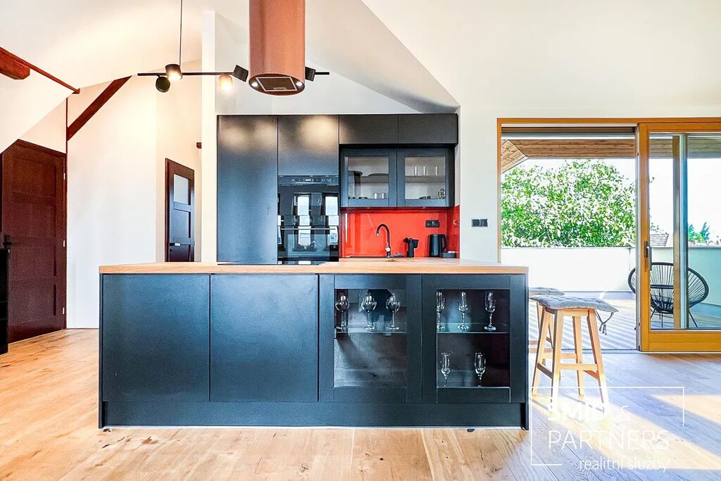 Tento podkrovní byt je luxusně vybaven moderní kuchyní, vířivou vanou, velkou terasou, prostorným obývacím prostorem, saunou a zahradou, která je k dispozici všem vlastníkům domu. Kuchyň je vybavena troubou, mikrovlnnou troubou, lednicí s mrazákem, indukcí a myčkou. Ve spolupráci s architektkou zde vnikl příjemný prostor k bydlení a zároveň místa pro relaxaci. Z terasy je výhled na zahradu, v jejíž zadní části je k dispozici pergola. Díky stromům a vyšším plotům zde můžete strávit čas v poklidu a relativně v soukromí.