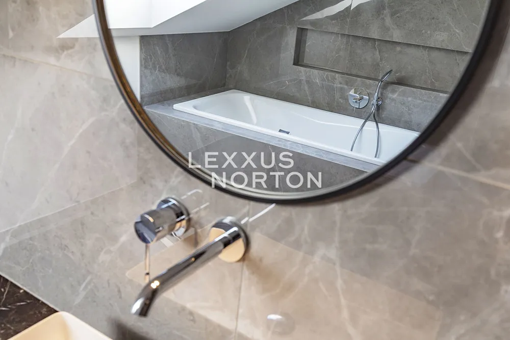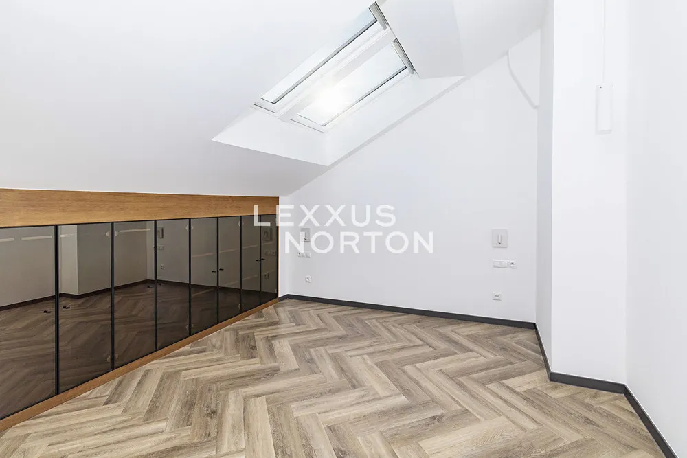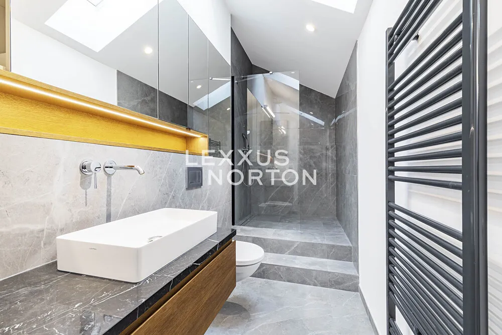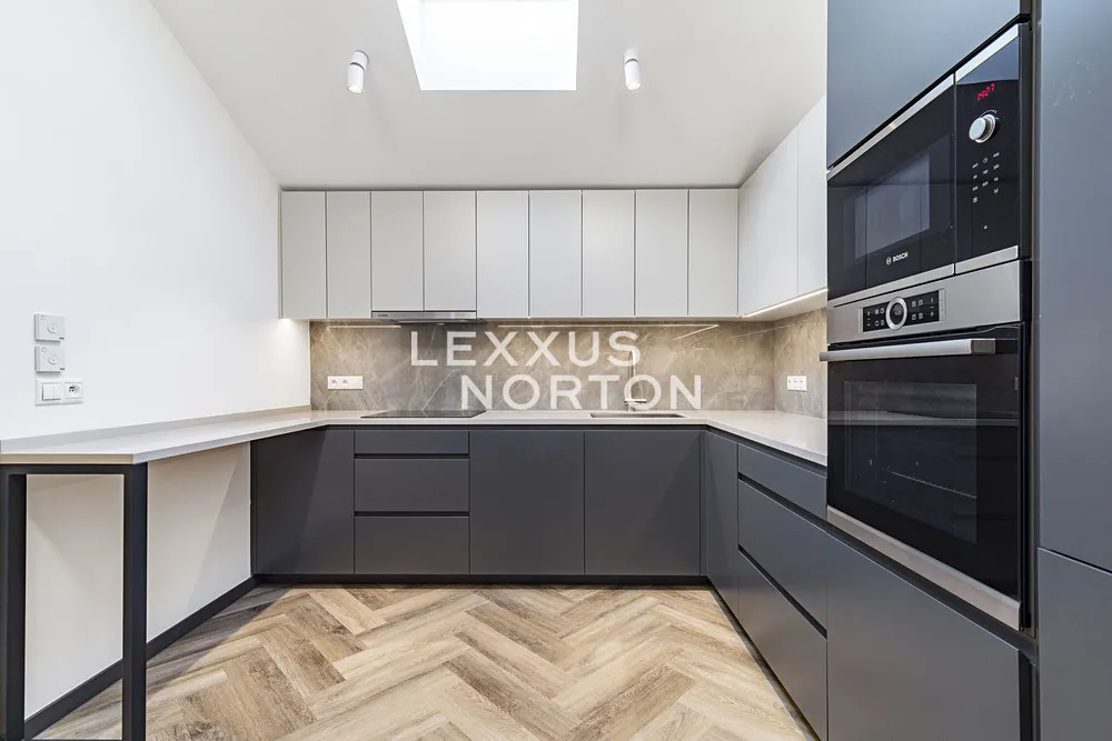Interiér bytu prošel kompletní a velmi kvalitní rekonstrukcí s důrazem na moderní design, nadčasové materiály a precizní řemeslné zpracování. Atmosféru domova podtrhuje promyšlené ambientní osvětlení, které vytváří příjemné světelné scény napříč celým prostorem. Kuchyňská linka je vybavena vestavěnými spotřebiči Bosch a nabízí vysoký komfort pro každodenní vaření. Součástí vybavení je také pračka a sušička Miele. Klimatizace zajišťuje příjemné prostředí po celý rok. Nová elektricky ovládaná střešní okna se systémem chytrého stínění přivádějí do interiéru dostatek denního světla a umožňují pohodlnou regulaci teploty i soukromí.