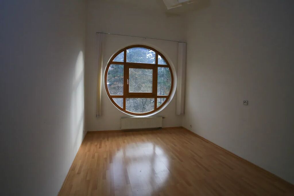 Na podlahách je položena plovoucí podlaha, okna jsou kvalitní dřevěná a ložnici zdobí designové kulaté okno, které dodává prostoru výjimečný charakter.