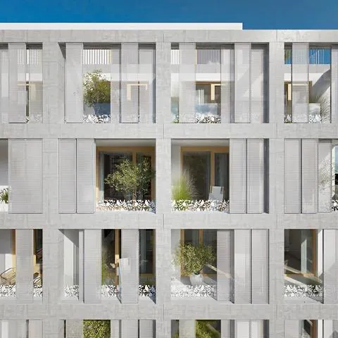 Na balkoně je vestavěná skříň, sloužící jako úložný prostor. Díky velkoformátovým oknům je byt světlý a působí prostorně.