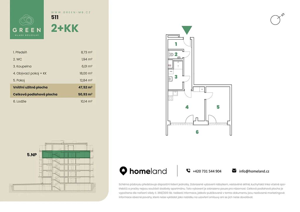 Světlý byt s prostornou lodžií o dispozici 2+kk a podlahové ploše 50,93 m² je součástí moderního rezidenčního projektu Green Mladá Boleslav. Projekt vzniká v atraktivní části Mladé Boleslavi, v těsné blízkosti golfového hřiště a zeleně, přesto však s výborným spojením do centra města. Dokončení a k nastěhování již jaro/léto 2026.