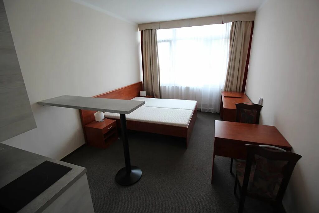 Nabízíme Vám k pronájmu vybavený byt s dispozicí 1+kk v bývalém Hotelu Fontána. Byt je vybaven kuchyňskou linkou, vestavnou skříní v předsíni, dvěma postelemi, nočními stolky a židlemi.