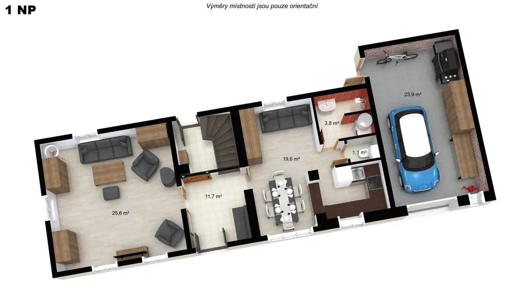 1. NP (Přízemí – cca 85 m²): Vstupní chodba (11,7 m²) se schodištěm spojuje obytnou část a zázemí. Najdete zde prostorný obývací pokoj (25,6 m²) s krbovými kamny, velkou kuchyni s jídelnou (19,6 m²), koupelnu (3,8 m²) a samostatné WC. Velkou výhodou je garáž/dílna (23,9 m²) přístupná přímo z domu – ideální pro parkování, kutilství nebo uskladnění kol a lyží.