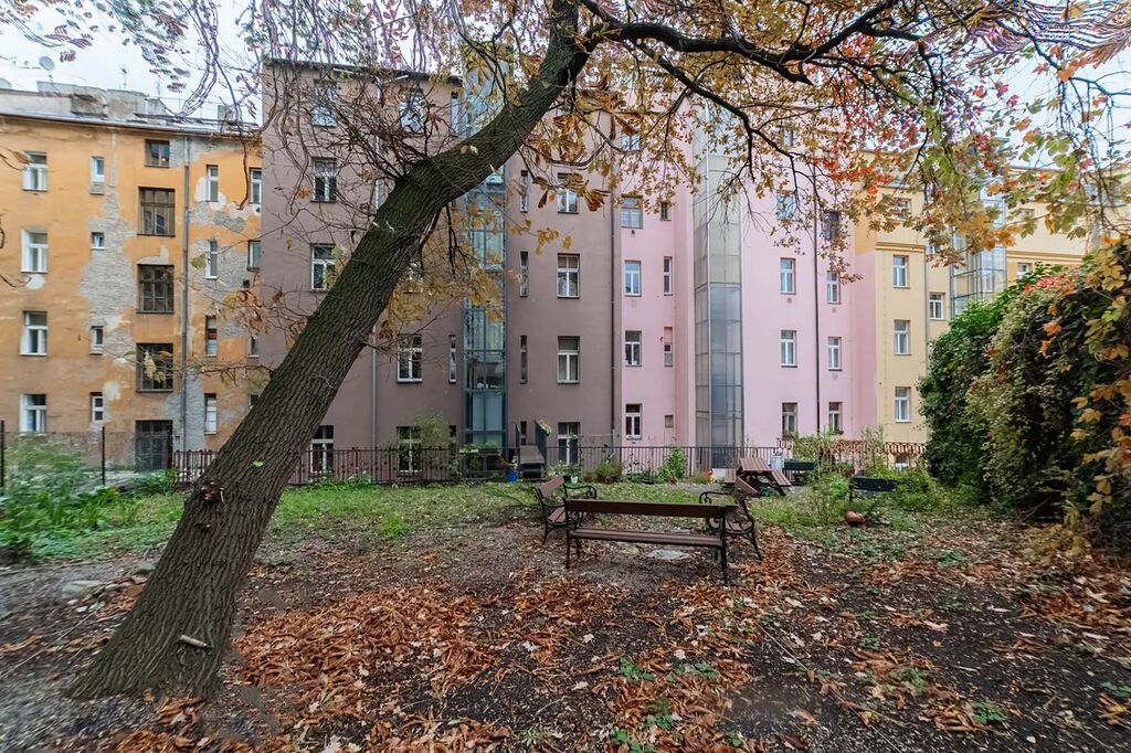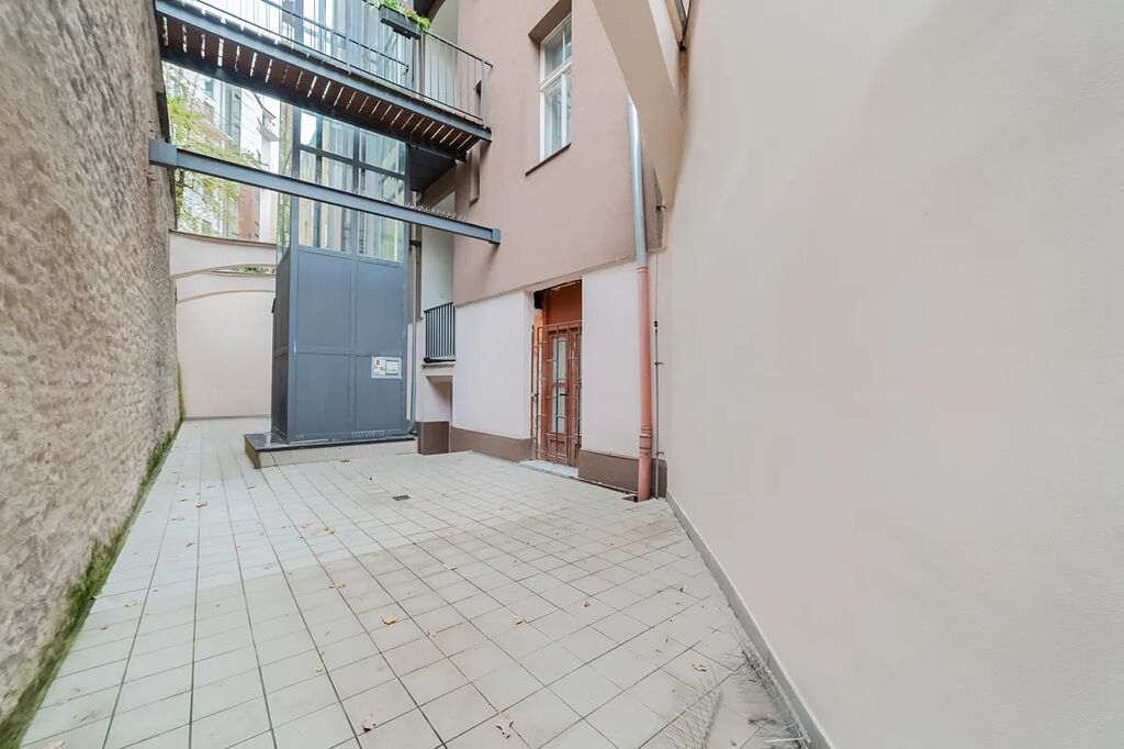 nebo rozdělení na více jednotek jsou k dispozici dva samostatné vstupy z chodby domu. Ze zadní místnosti je možnost vstupu na domovní dvůr s možností využití zahrady(za příplatek SVJ), kde je také nový domovní výtah.