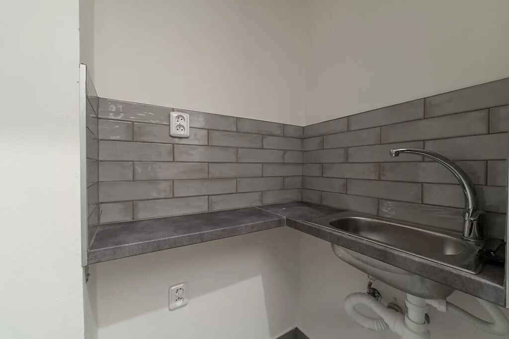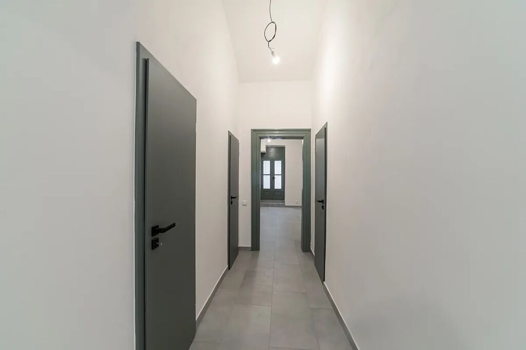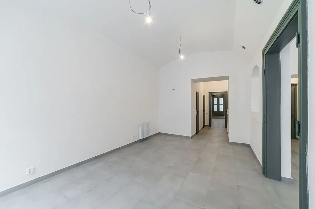 V této chvíli probíhá v prostoru rekonstrukce (nové dveře, topné radiátory, dlažba, elektroinstalace, malá kuchyňka, bojler, bílé stěny).