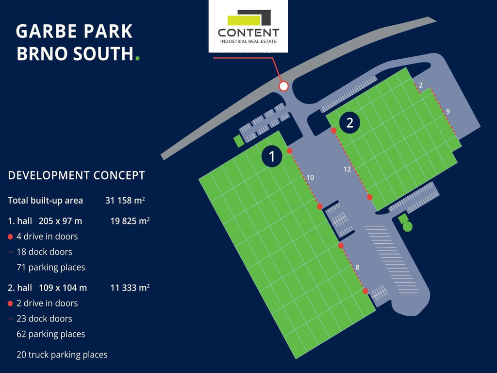 V zastoupení majitele a bez provize nabízíme novostavbu skladu nebo výrobních prostor o velikosti 19825 m², umístěnou v moderním parku nacházejícím se podél dálnice D52, EXIT 23.