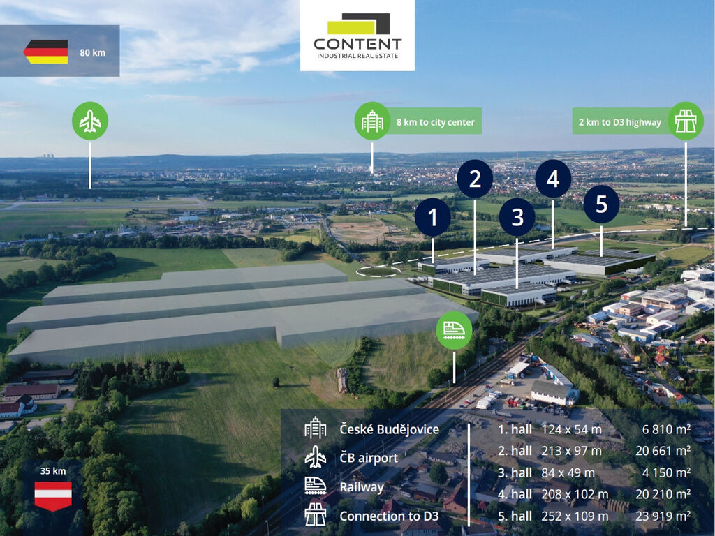 V zastoupení majitele a bez provize nabízíme novostavbu skladu nebo výrobních prostor, umístěnou v moderním parku nacházejícím se podél silnice E55 s přímým napojením na mezinárodní dopravní síť (České Budějovice - Linz). Nové spojení ''Jižní tangenta'' s Českými Budějovicemi a dálnice D3 je v současné době ve výstavbě.