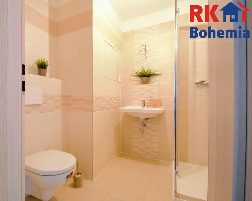 Koupelna je zařízena sprchovým koutem, umyvadlem a toaletou. Nechybí ani příprava na zapojení pračky.