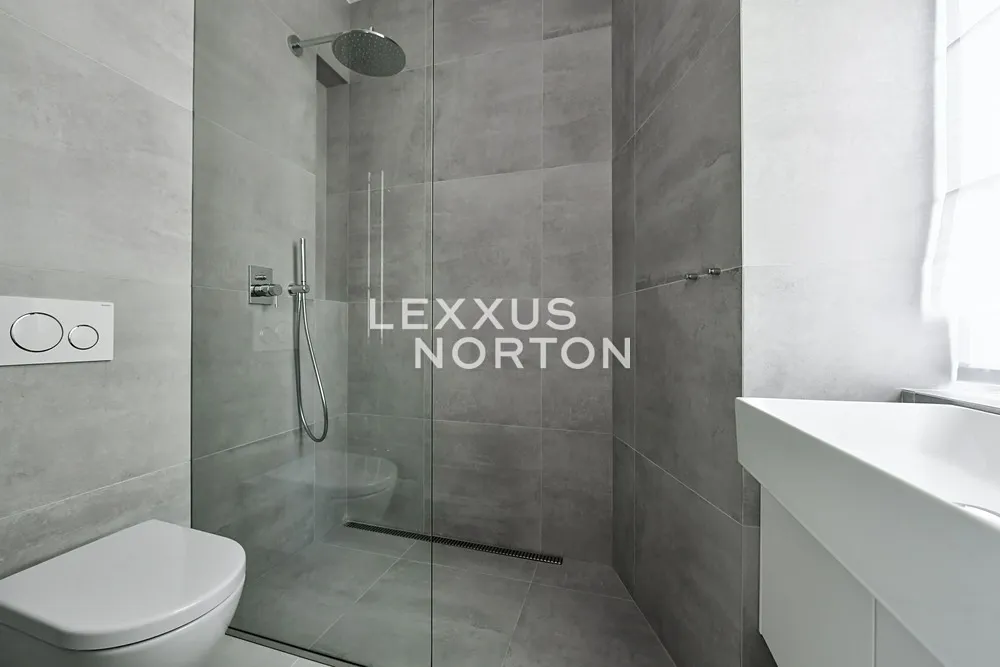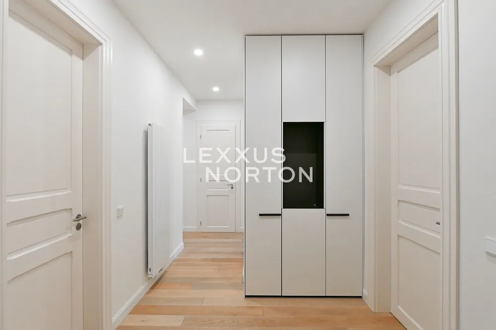 Byt je vybaven kvalitními dubovými podlahami a nabízí vestavěné skříně, klimatizaci, vinotéku, pračku i sušičku. 2 koupelny disponující sprchovým koutem.