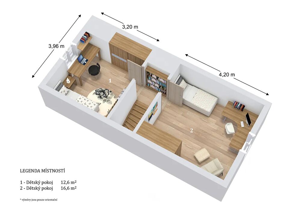 2. NP - 29,2 m²: dva dětské pokoje - 12,6 m², 16,6 m².