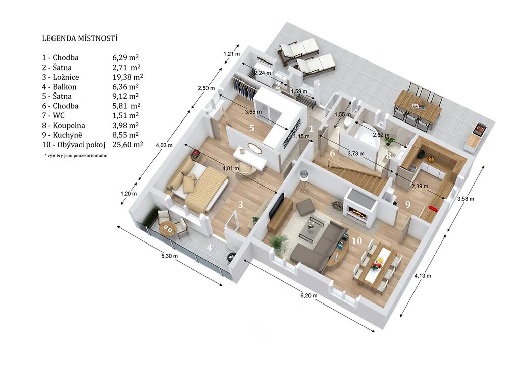 1. NP - 89,31 m²: chodba - 6,29 m², šatna - 2,71 m², ložnice - 19,38 m², balkon - 6,36 m², šatna - 9,12 m², chodba - 5,81 m², WC - 1,51 m², koupelna - 3,98 m², kuchyně - 8,55 m², obývací pokoj - 25,60 m².