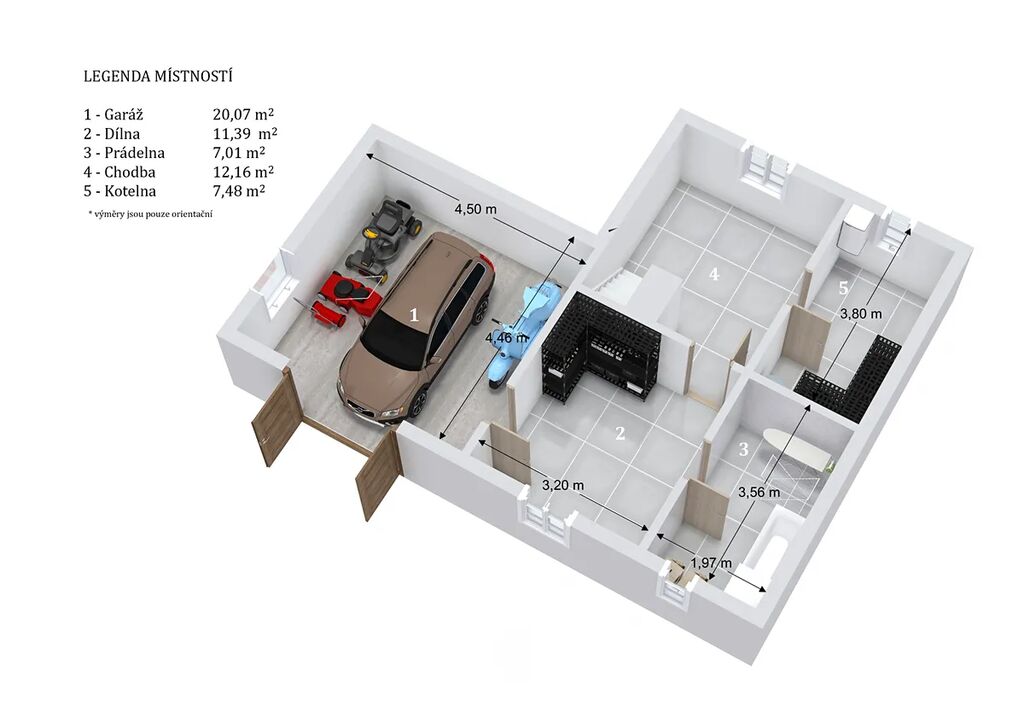1. PP - 58,11 m²: garáž - 20,07 m², dílna - 11,39 m², prádelna - 7,01 m², chodba - 12,16 m², kotelna - 7,48 m².