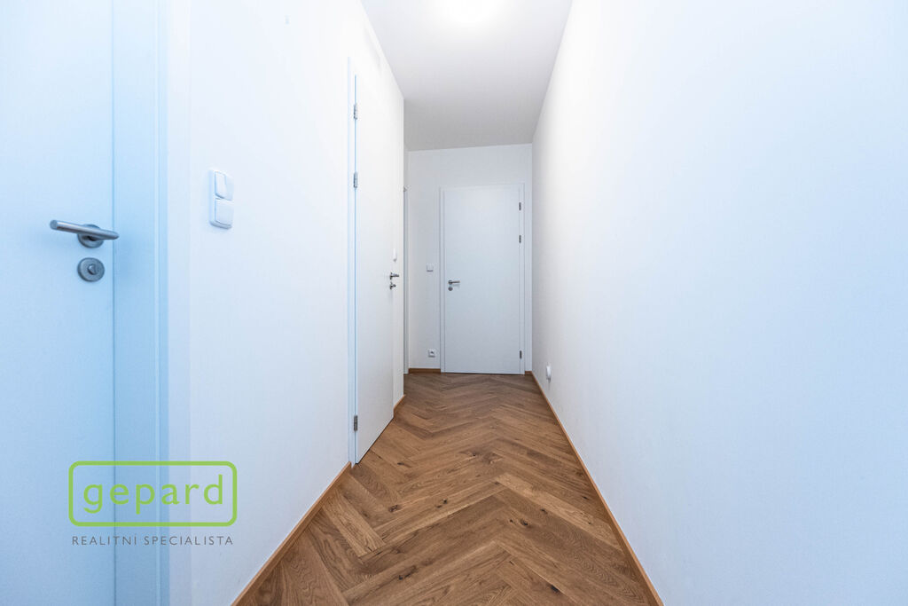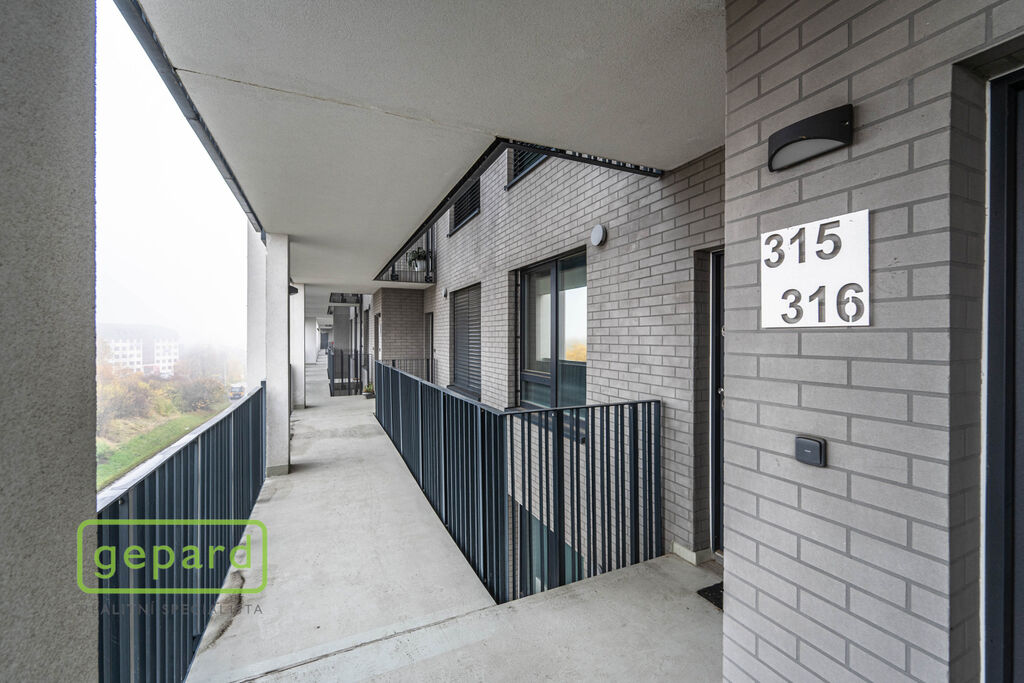 Byt se skládá z obývacího pokoje s kuchyňským koutem o velikosti 21m2 se vstupem na balkon 4,7m2, ložnice s šatnou 12,6m2, chodby, koupelny s vanou společnou s WC a komorou v bytě o velikosti 1,7m2. Okna z obývacího pokoje jsou orientována na jihozápad do upraveného vnitrobloku. K dispozici je kuchyňská linka s myčkou, troubou a varnou deskou.