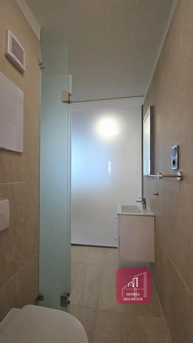 Nová, prosvětlená designová koupelna nabízí moderní sprchový kout, umyvadlo, zrcadlo, skříňku pod umyvadlem a toaletu.