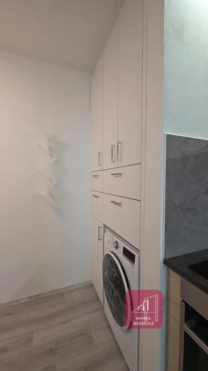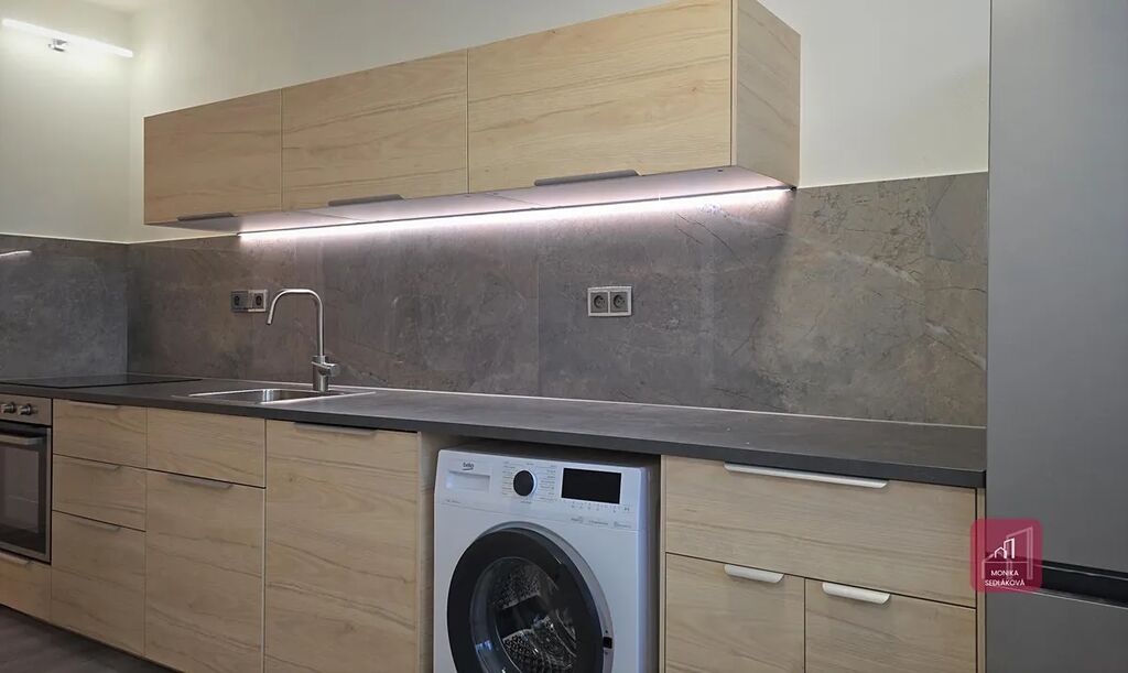 Kuchyně je vybavena indukční varnou deskou, el. troubou s grilem, myčkou a úplně novou lednicí s mrazákem. K dispozici je zde nová pračka a sušička. V případě zájmu je možné od majitele mít i jídelní stolek s židlemi.