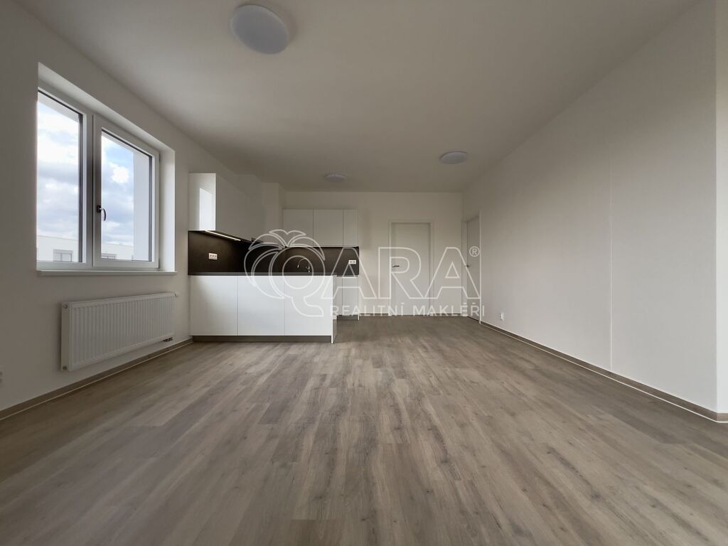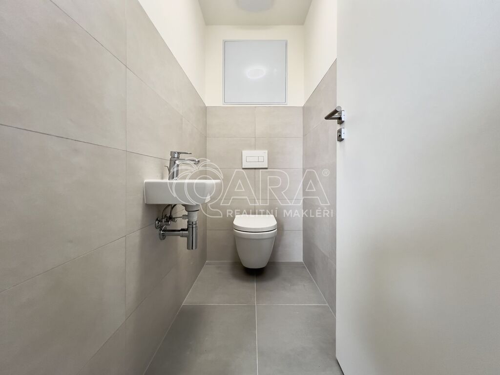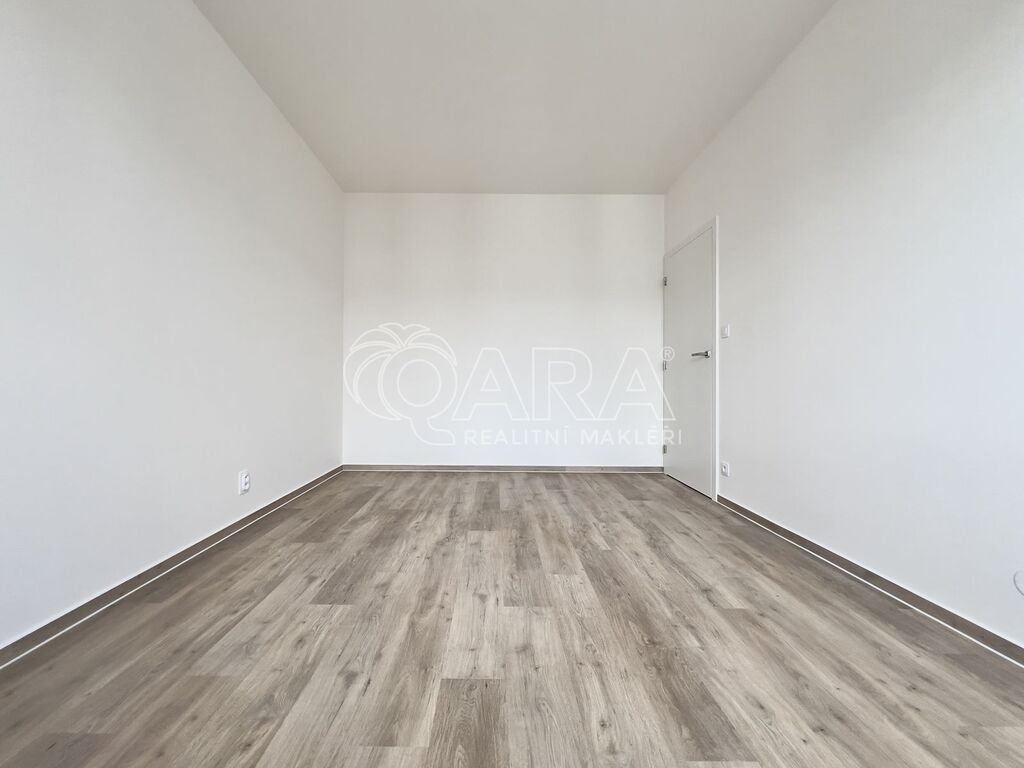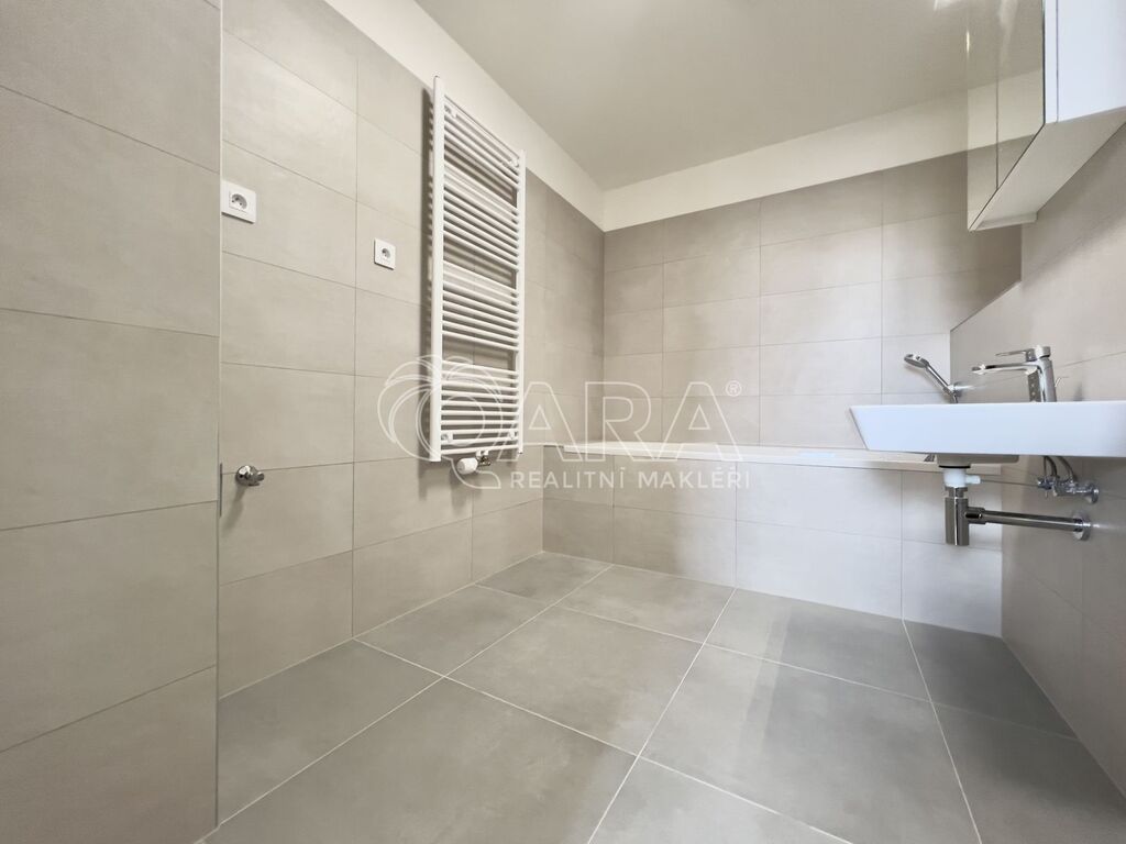 Bytová jednotka o výměře 76,8 m² se nachází v 1. nadzemním podlaží (zvýšené přízemí) novostavby z konce roku 2023 (dva výtahy jsou samozřejmostí). Byt se skládá z předsíně o výměře 8,4 m², ze které se dostaneme do kuchyně spojené s jídelnou a obývacím pokojem o výměře 26,9 m², která je zařízena kuchyňskou linkou s elektrickou troubou, čtyřplotýnkovou indukční varnou deskou a digestoří (další spotřebiče nebudou součástí nájmu). Z kuchyně je přístupný balkon o výměře 4,5 m². Se vstupem z předsíně jsou přístupné dva vzájemně neprůchozí pokoje o výměře 12,6 a 13,6 m². Koupelna je přístupná také z předsíně a je vybavena vanou, umyvadlem, skříňkou se zrcadlem a přípojkou na pračku. Dostatek místa na sušičku je samozřejmostí. WC je samostatně. Byt se pronajímá jako nezařízený, tudíž si jej můžete vybavit podle svých vlastních představ. Součástí je i samostatný zděný sklep o výměře 1,4 metrů čtverečních. K dispozici je garážové parkovací stání pro jedno auto (není podmínkou nájmu).